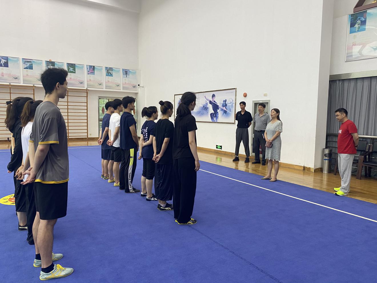 为迎接本次比赛,上海市教委任命我校组队并选拔上海市优秀武术运动员参赛。经过两个阶段的备战选拔,来自复旦大学、海事大学、上海大学、上海体育学院和开云电竞官网下载安卓的6名运动员脱颖而出,组成上海代表团大学组武术队。武术队充分利用寒暑假等休息时间,防疫情、保训练、组竞赛、做筹备,投入比以往更多的精力,付出更多的努力;运动员们更是克服大运动量、高强度训练带来的伤病,在训练场上挥洒汗水,精细动作细节,精进技术水平。学校各部门亦为保障训练有序开展,提供全方位的支持与帮助。队伍出征前,我校党委副书记、副校长朱惠蓉在训练场为上海武术代表团加油鼓劲。