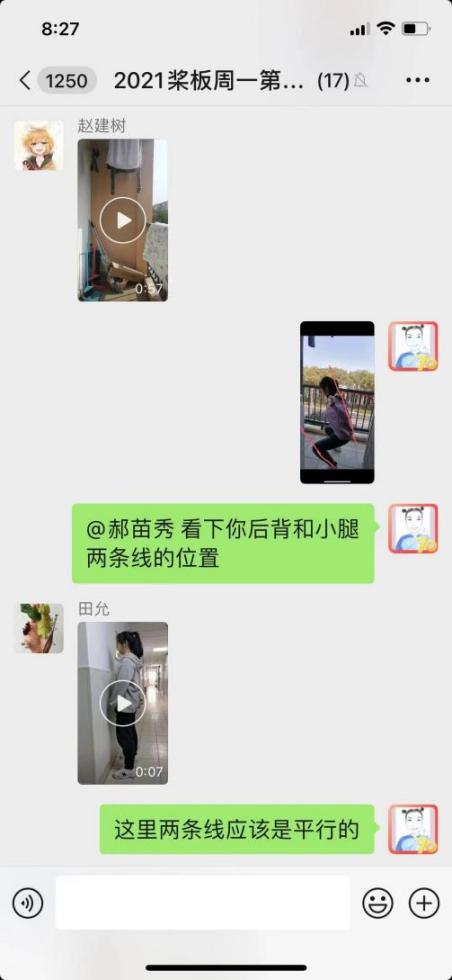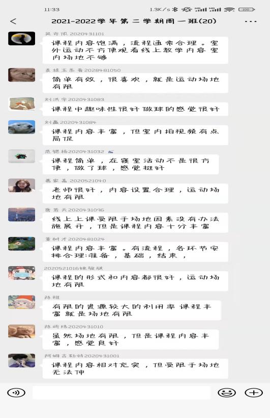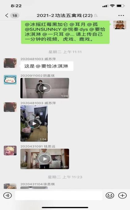 为发扬“顽强拼搏”的中华体育精神,鼓励宅在宿舍的同学们克服困难,“足不出户”每天坚持运动一小时,增强抵抗力,针对在狭小空间无法开展的体育项目,老师们借助微信群或校课程中心平台推送以体能训练为主的锻炼内容和任务,通过班级微信群,实时在线对同学们的锻炼进行指导,同学们利用拍摄小视频、照片等方式记录个人锻炼情况,并填写锻炼日志。