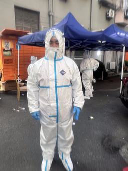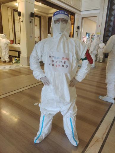 工作期间,他严格按照二级防护服入楼要求,负责12层楼三餐分户送餐。每次送餐他都尽可能以最快的速度将热餐送到被隔离的教工、学生房间,但依旧需要一个多小时才能完成。如遇天气炎热,加上楼内空气封闭,运动量大,每次完成任务后,浑身湿透,手被泡白,但他从不退缩、没有一句怨言,反而觉得能够冲到一线参加这场战斗,很自豪,很有成就感。经过这一周的特殊任务,也让他更加深刻体会到抗疫一线医务人员的不易,心中多了一份对他们的敬意。