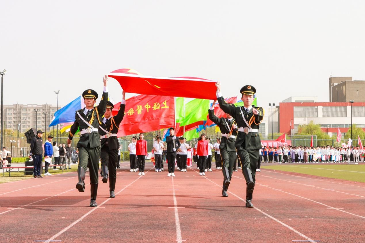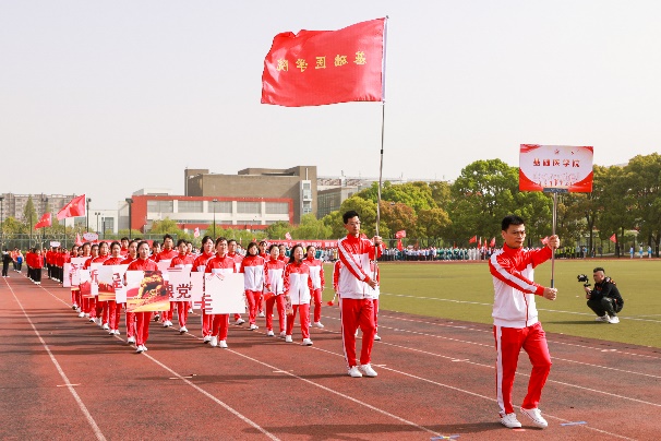 随着雄壮的《运动员进行曲》响起,校国旗护卫队队员擎着鲜艳的五星红旗,身着整齐的制服,迈着矫健的步伐步入运动场,带领着校旗队、彩旗队方阵及由学校30家系统单位师生代表组成的运动员表演方阵有序入场。