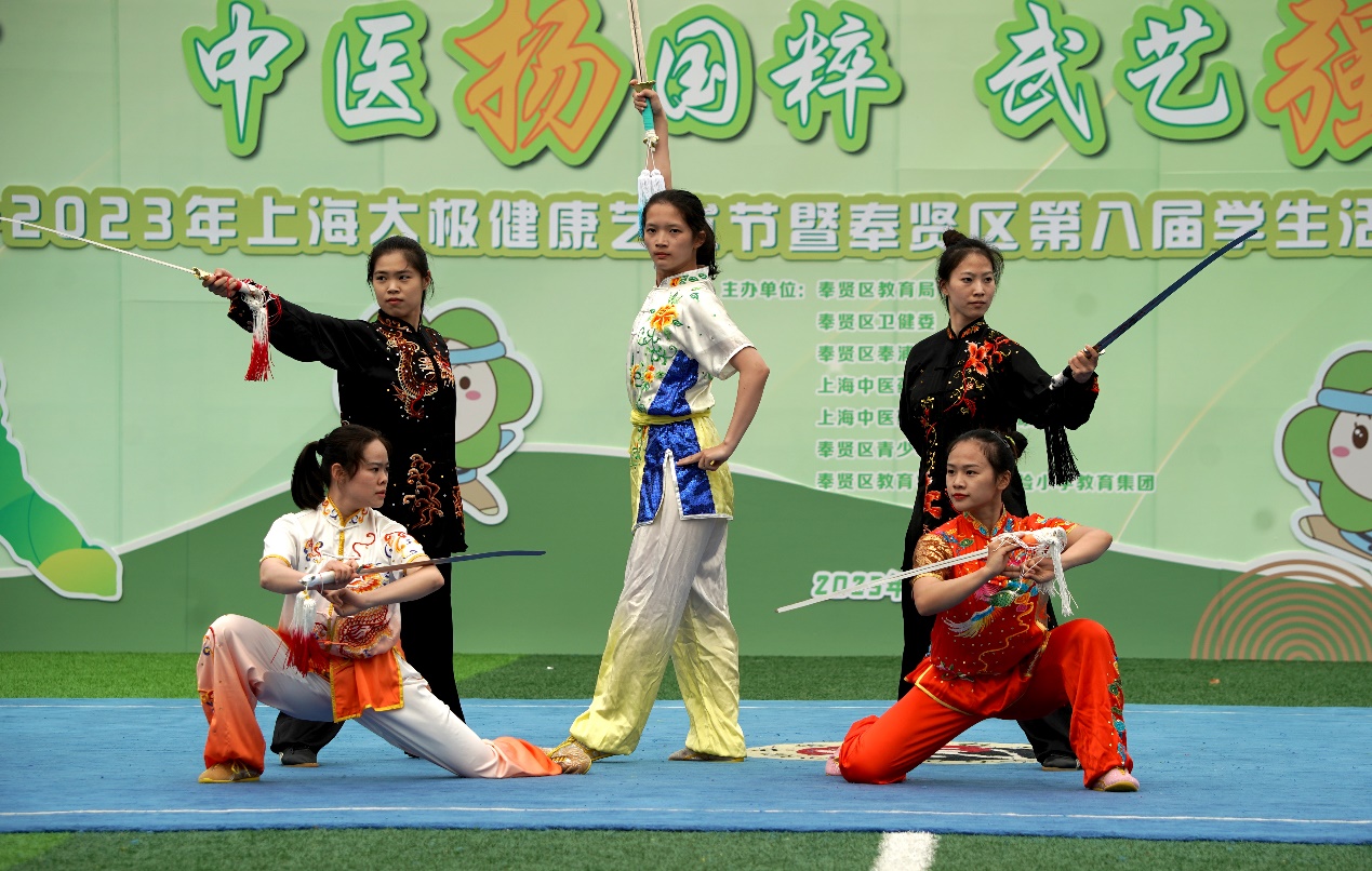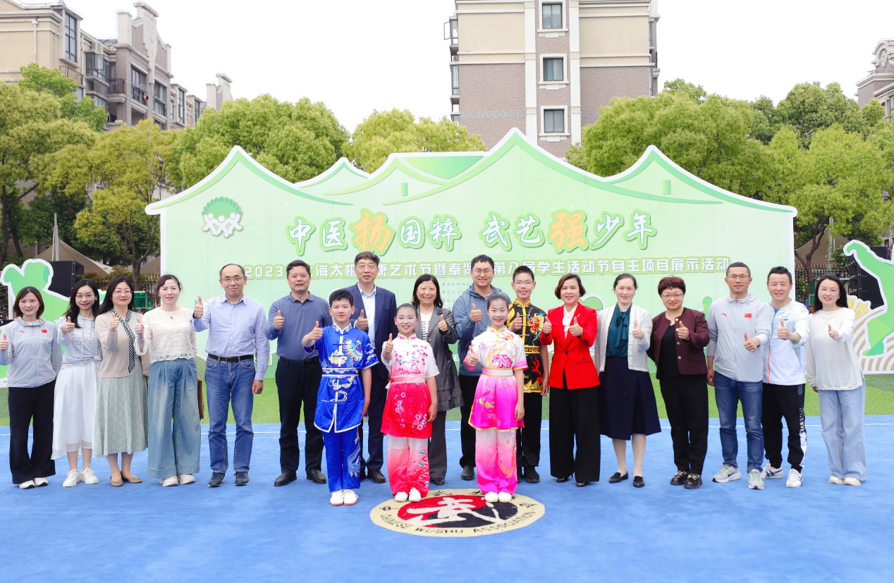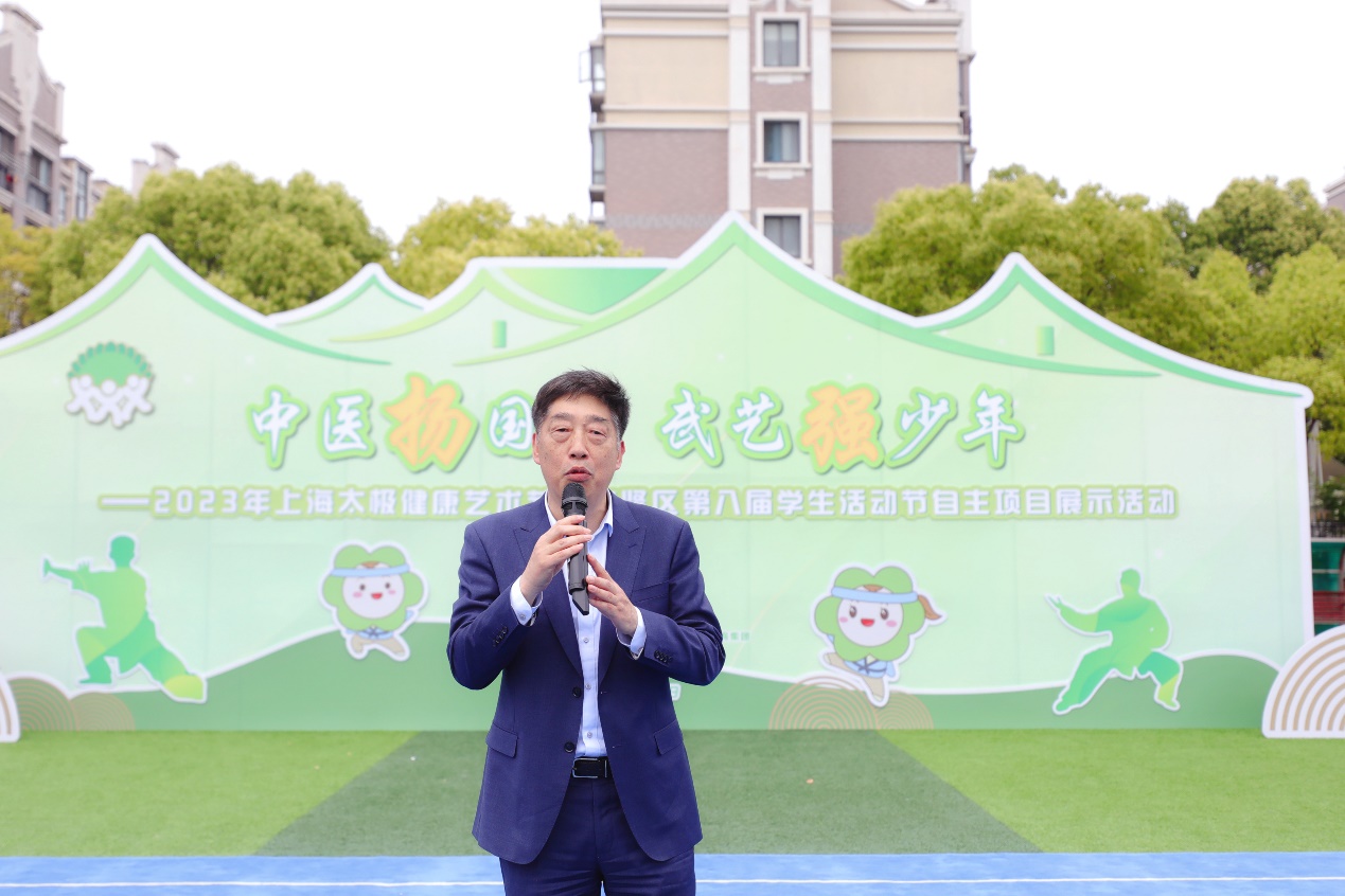 428日,我校与上海市奉贤区教育学院附属实验小学教育集团(以下简称“教院附小”)联合举办“中医扬国粹 武艺强少年”2023年上海太极健康艺术节暨奉贤区第八届学生活动节自主项目展示活动。奉贤区教育工作党委书记、区教育局局长施文龙,奉浦街道办事处主任李晓芬及相关工作负责人等;上海市中医药研究院综合办公室主任李洁,上海市气功研究所所长许峰,上海市武术协会副会长吴志坤,我校体育部教师,以及教院附小全体师生,奉贤区惠敏学校、育贤小学、四团小学、塘外小学、奉城第二小学集团校部分师生代表参加活动。展示活动在教院附小操场举行。通过举办内容丰富的系列活动,增进中小学生对中华优秀传统文化的了解与认同。