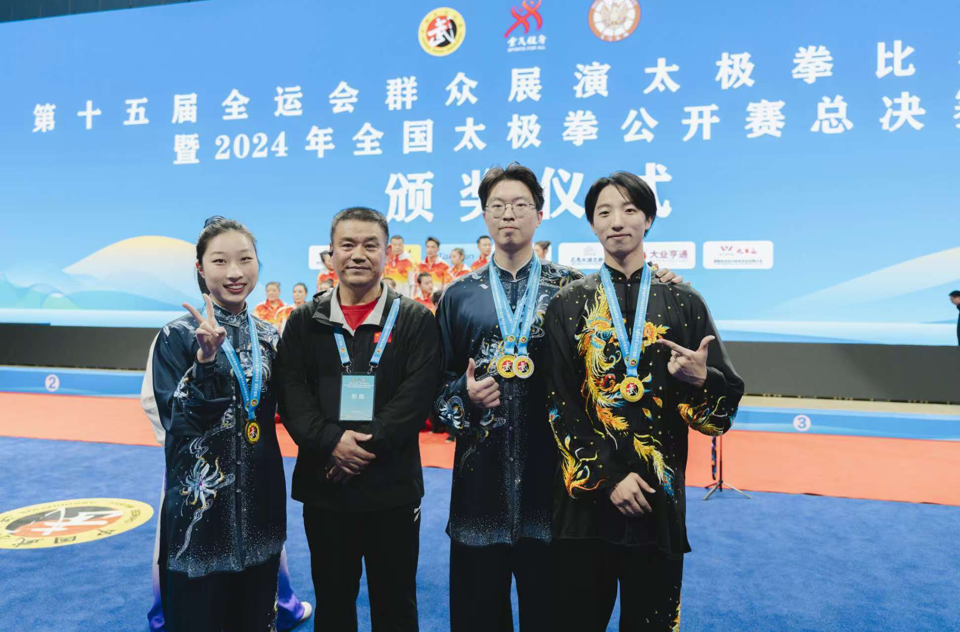 在本次总决赛中,经过激烈角逐,我校武术运动员尹鑫、李圣敏、寿璐珈在个人项目和集体项目中取得了四金一银一铜的优异成绩,并获得直通第十五届全运会群众展演太极拳总决赛阶段比赛的资格。