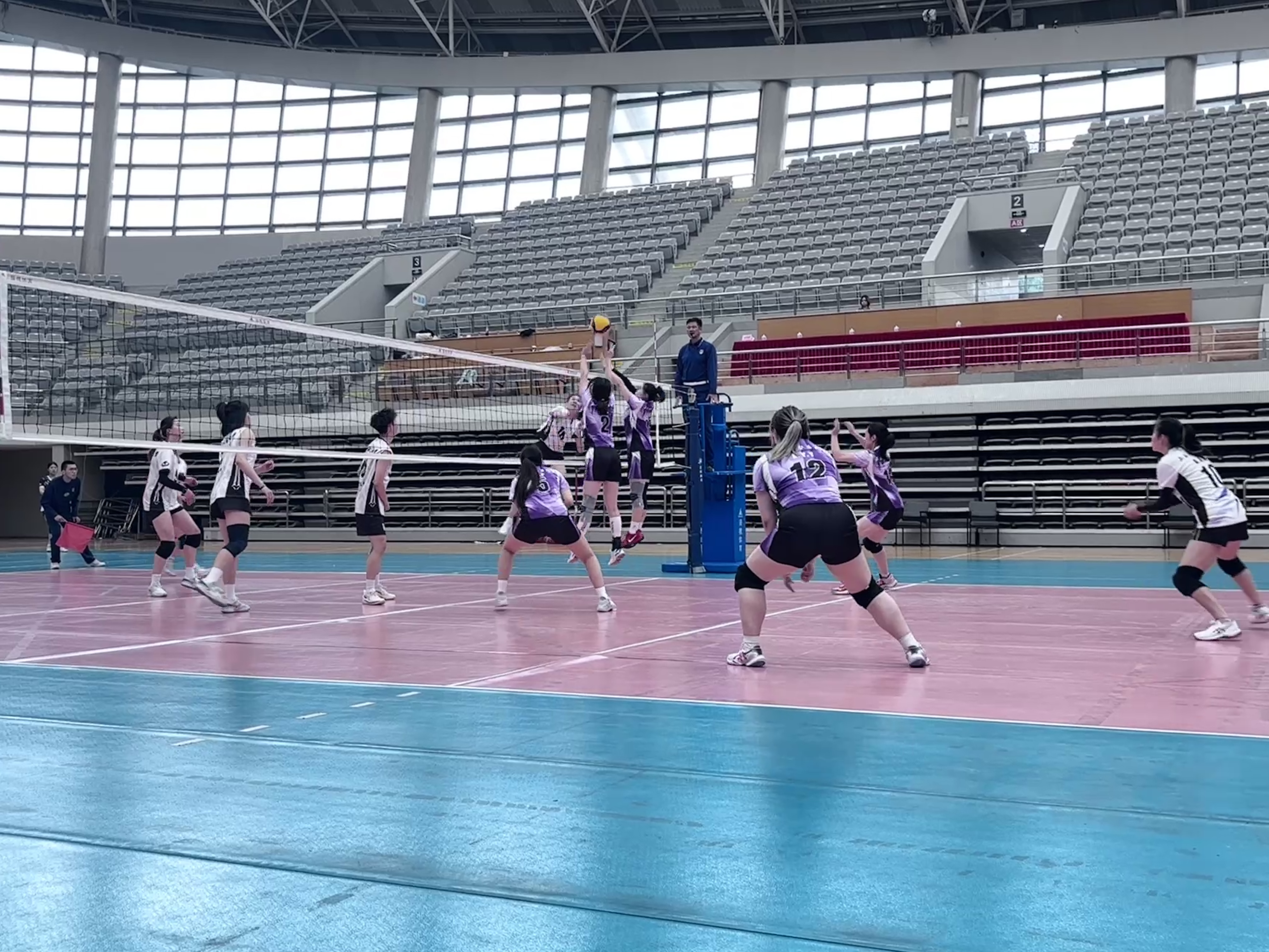在季军争夺战的首局中,面对对手的强势开局,我校女排一度以0:5落后。在关键时刻,教练团队迅速作出暂停,调整战术,队员们通过加强拦网和控制发球落点,逐步追平比分。随后,比赛进入白热化阶段,双方你来我往,比分交替上升,在队员的共同努力下,以25:22艰难拿下首局,为后续的比赛奠定了坚实的基础。