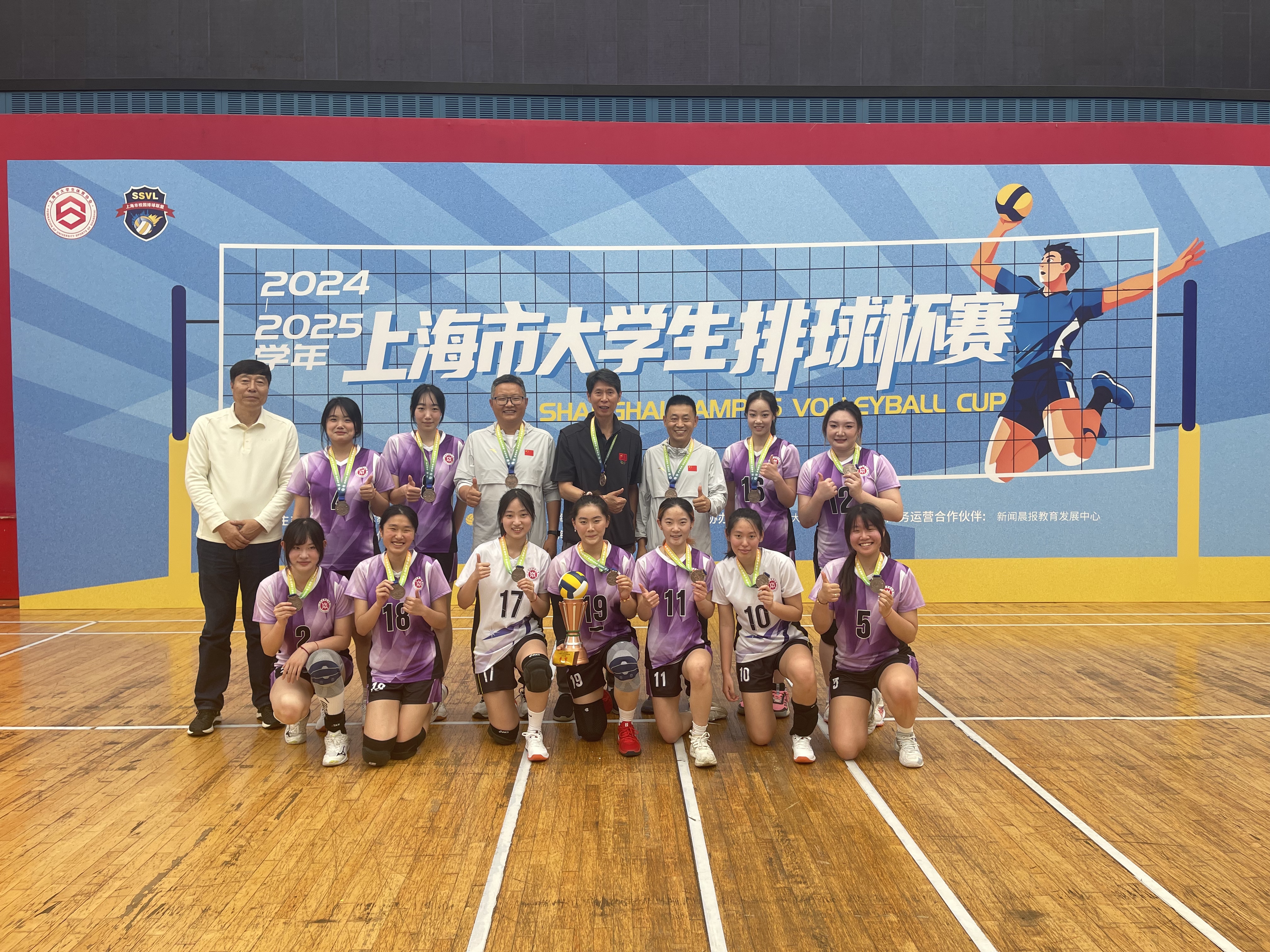 2025年4月26日至5月10日,由上海市教育委员会、上海市体育局主办,上海市大学生体育协会、上海市校园排球联盟承办的2024-2025学年上海市大学生排球杯赛,在复旦大学正大体育馆圆满收官。复旦大学、华东师范大学、上海体育大学等高校队伍齐聚一堂,展开激烈角逐,我校女子排球队凭借坚定的意志和默契的团队协作,在季军争夺战中以3:1击败上海体育大学,获得第三名。