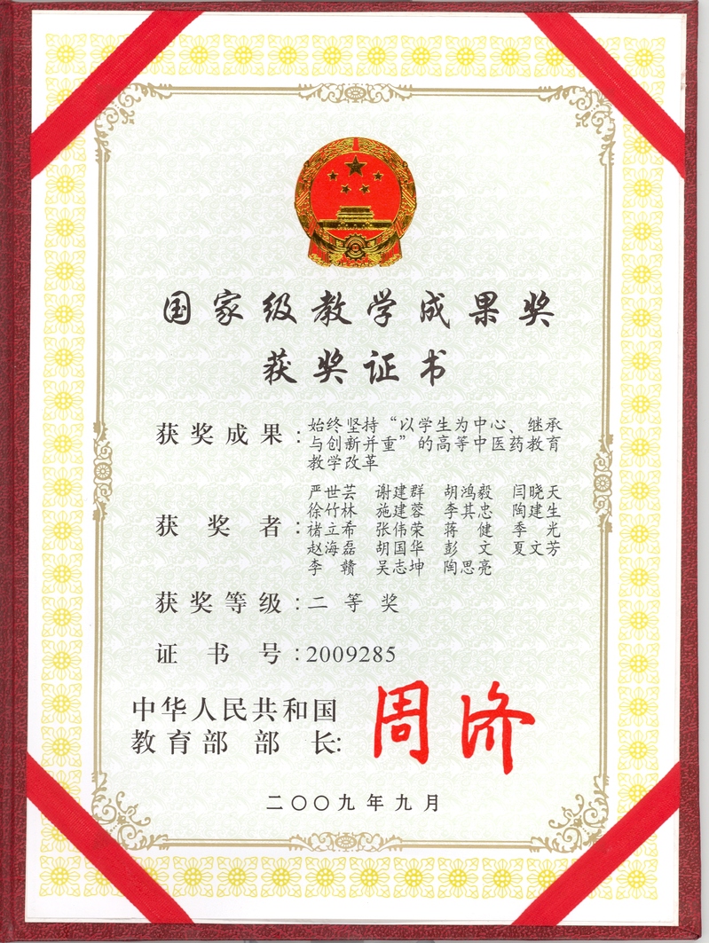 由严世芸教授领衔的教学研究项目“中医人才培养模式的研究与实践”,获上海市教学成果奖一等奖,国家教学成果奖二等奖。