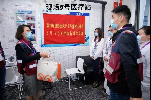 现场医疗组是五位研究生同学,本科均为临床专业。主要协助医疗站点老师为进口博览会相关区域参观、参展等人员提供临时、便捷的医疗服务。对危重病人、特殊病人开展院前先期处置和伤病员转送工作。开展展区内重点疾病的监测工作。对出现身体不适的病人先进行测温和血压检测,并根据情况选择对应的处理方案。他们用知识,扛起了现场医疗的大旗。