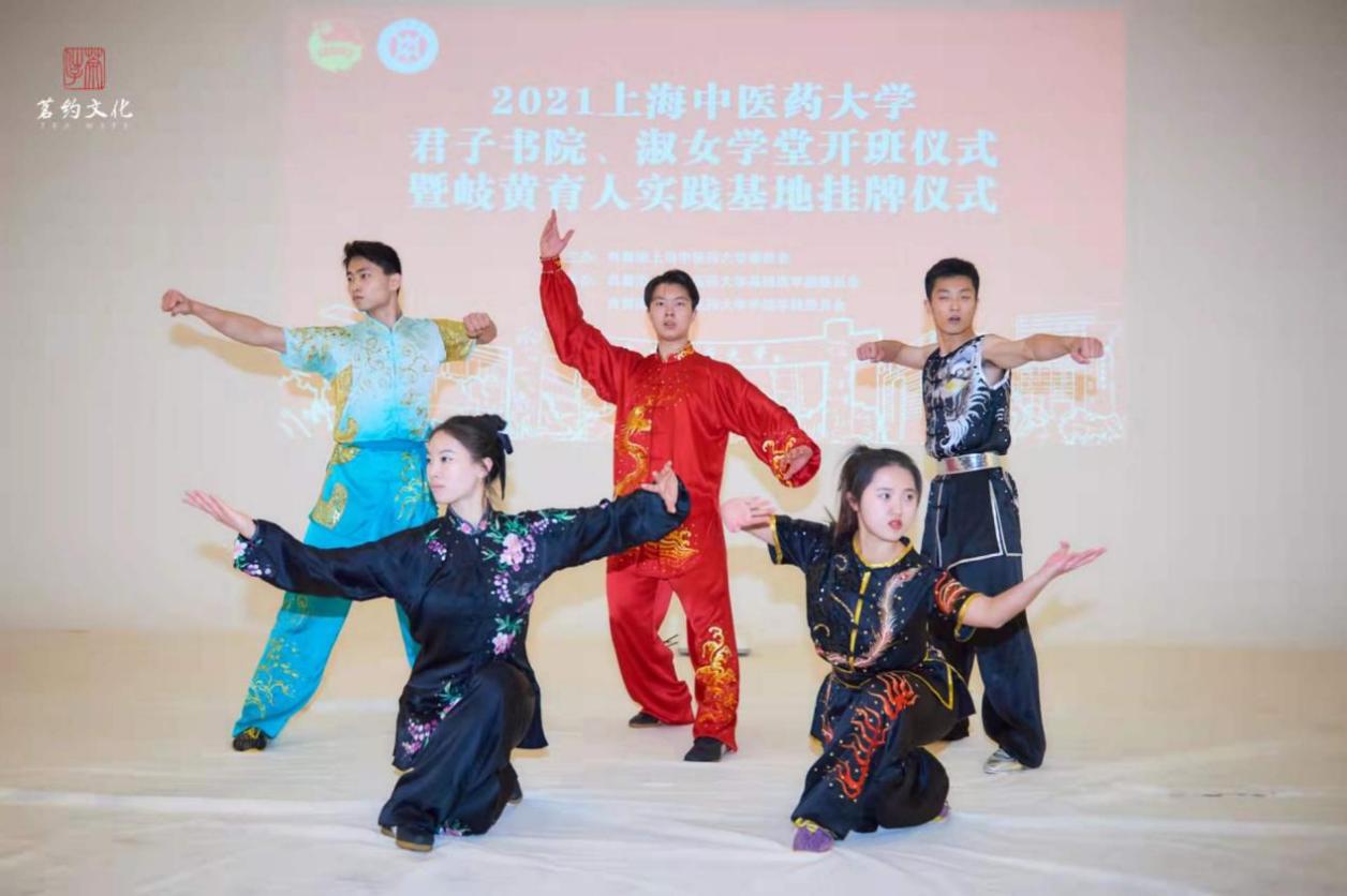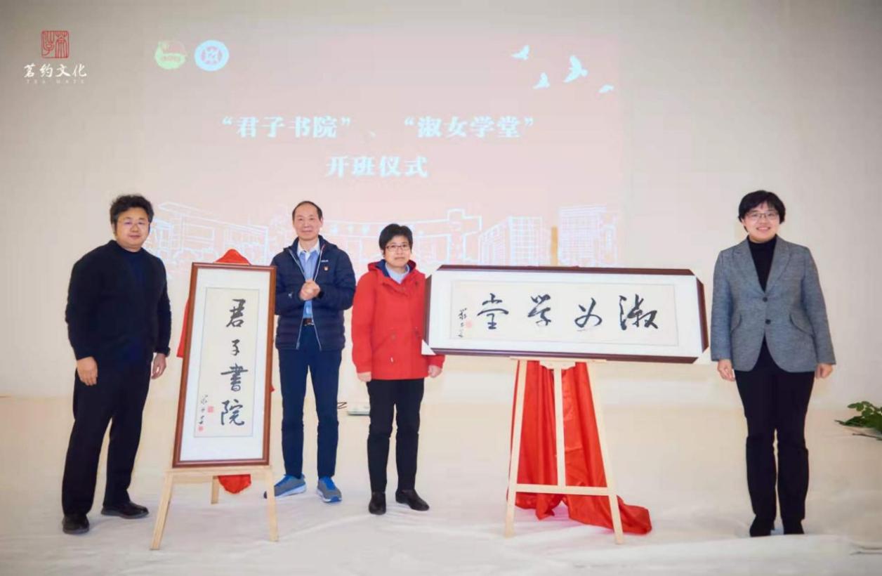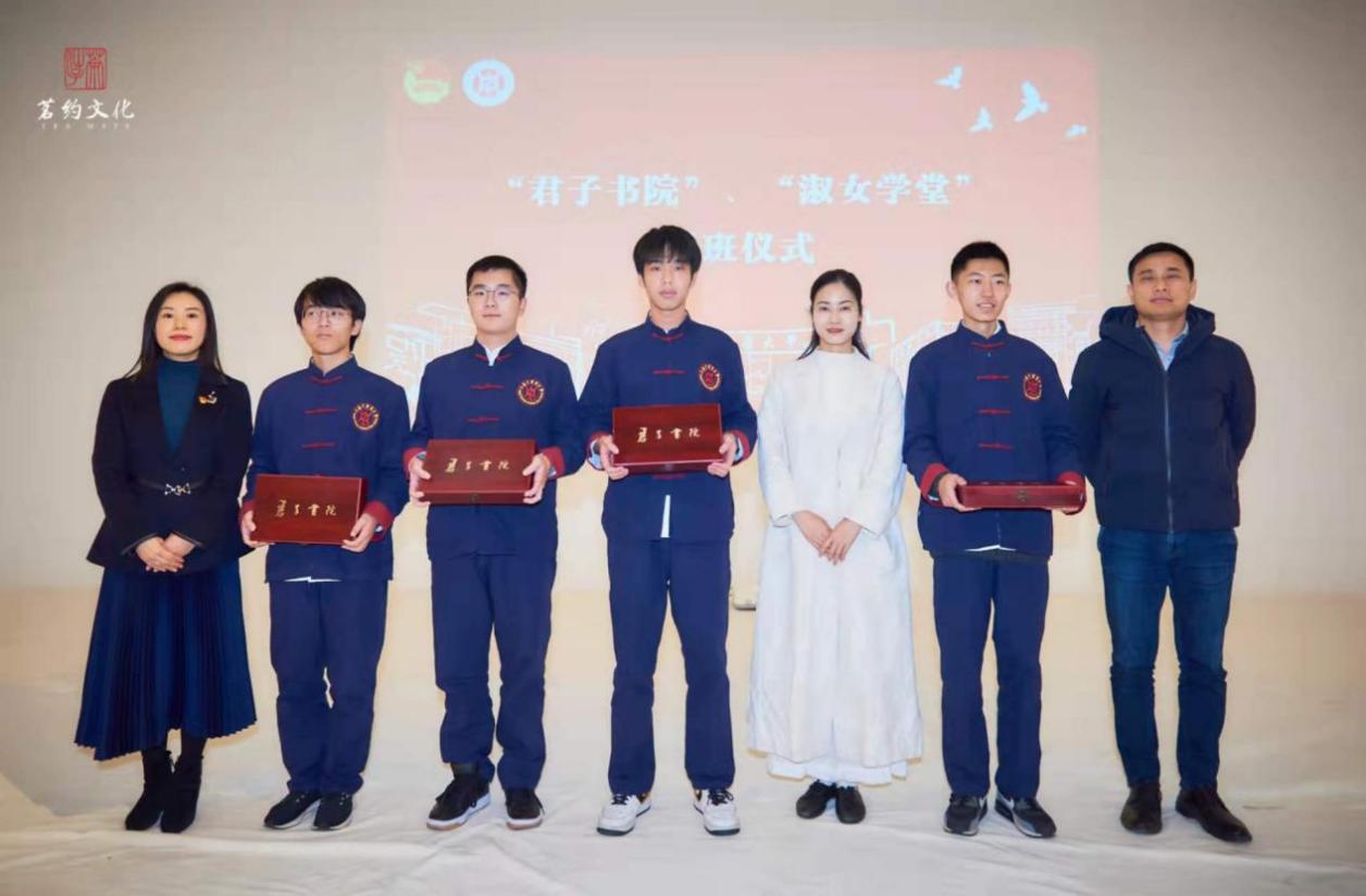 朱惠蓉和鲍丽丽为“茗约茶文化艺术中心”岐黄育人实践基地揭牌。上海大学文学院教授刘旭光,我校学工部(研工部)部长沈漫、护理学院党总支书记史美育、基础医学院党委书记夏文芳共同为“君子书院”“淑女学堂”揭牌。基础医学院和护理学院负责人分别介绍本届“君子书院”“淑女学堂”的筹备情况和培养方案。校职能部门、二级学院和茗约文博园的领导们,分别为“君子书院“学员代表颁发“文房四宝”,为“淑女学堂”学员代表颁发“茶艺用具”。