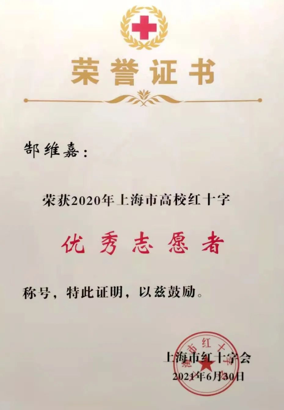 上海市红十字“一星级志愿者”