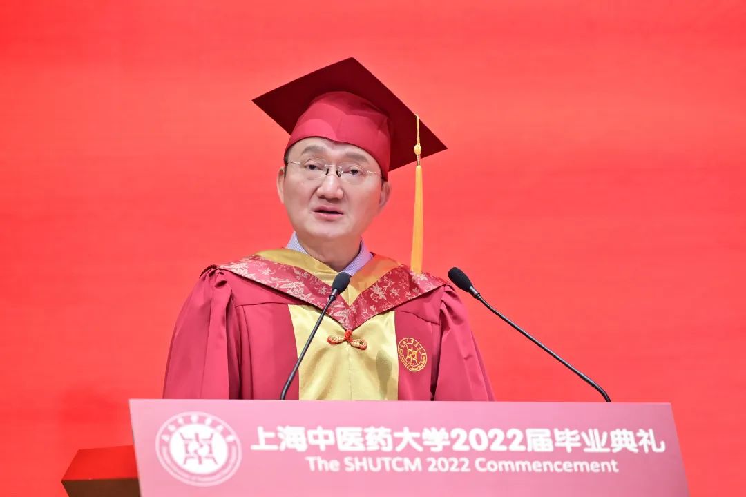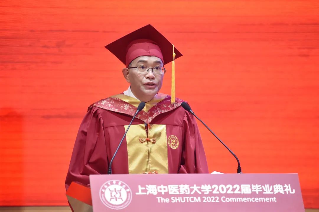 校长徐建光带来“毕业生最后一课”,他指出,成长,就是对生命深度、高度和厚度的不断追寻。这些年,学习尽在其中,同学们深挖着学业的深度。停课不停学,多重角色的设定,多方位的学术盛宴,也让你们拥有了N种花式打开网课的技能。这些年,担当尽在其中,同学们见证着职业的高度。以有温度的服务彰显医者仁心,打出了一套中医青年抗疫“组合拳”。这些年,情怀尽在其中,同学们探寻着人生的厚度。在战“疫”中感悟中华文化的力量,体会大医精诚精神内核。随后,他赠送毕业生一副“疫”方。第一个,气正:坚守本心、恪守大道,让个人梦想与民族伟业同频共振。第二个,气顺,同学们要风云笑看、天高云淡,让格局心态在乱云飞渡中愈发从容。第三个,气韧,同学们要咬定青山、勇毅前行,美好的未来一定在不远处等你。他希望同学们去汇聚个人梦想与追求的正气,把个人追求与国家前途紧密结合,肩负时代赋予的使命,在每一场奔赴梦想的极限挑战中乘风破浪!