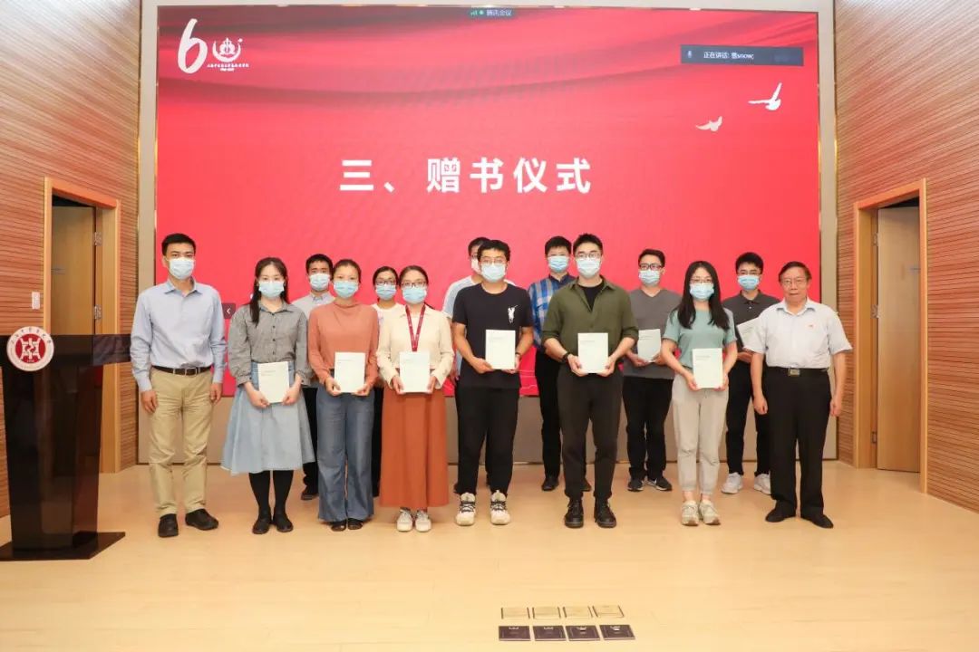 杨德广与基础医学院院长吕嵘向青年教师赠送《高等教育改革的探索与反思》一书。