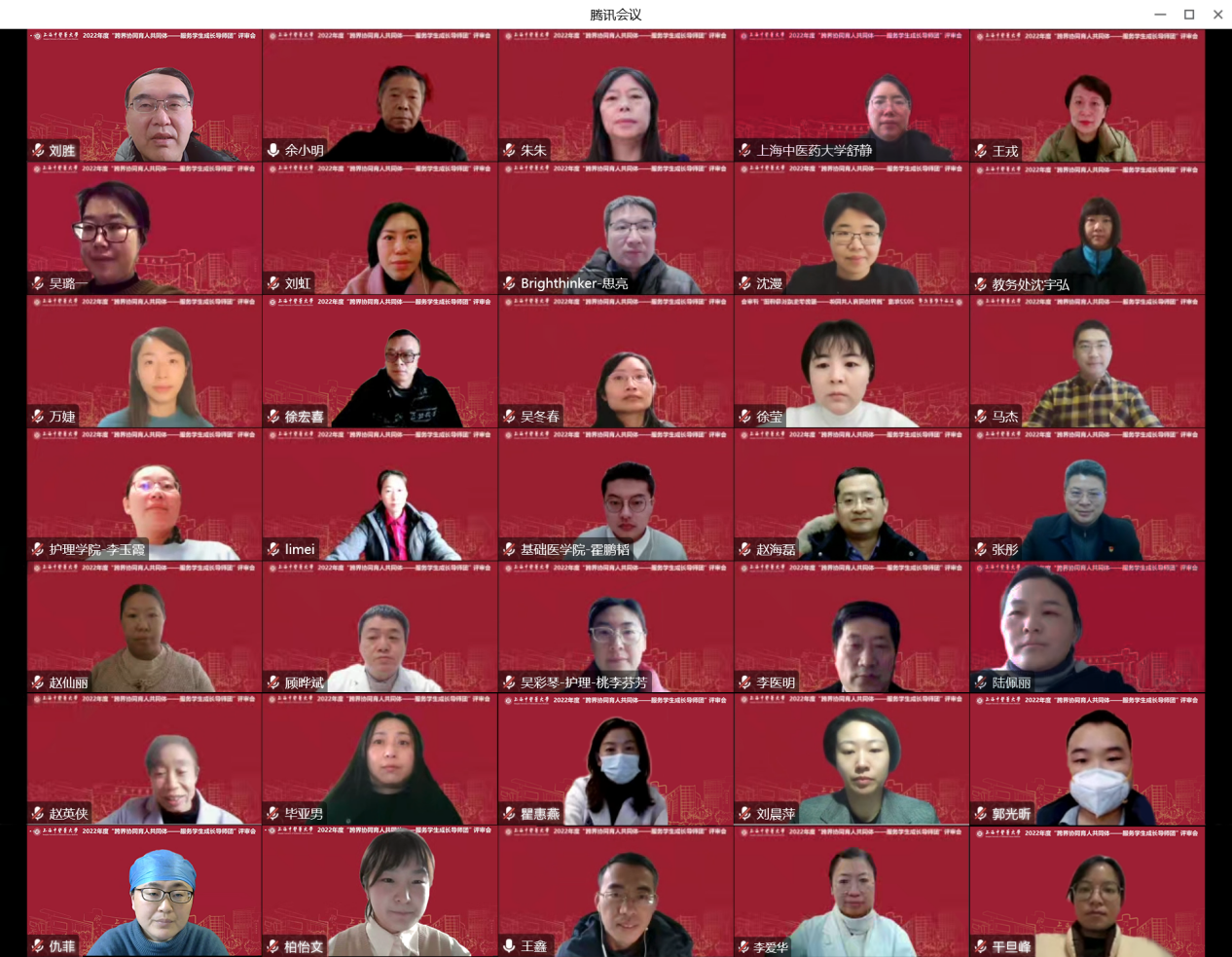 2022年12月30日,我校线上举行2022年度“跨界协同育人共同体——服务学生成长导师团”评审会。校党委副书记、副校长朱惠蓉,副校长舒静,原副校长、关工委副主任余小明,上海市教育科学研究院副院长、德育发展研究院(筹)院长王戎,校学生工作部(处)、教师工作部、团委、教务处、科技处、研究生院和马克思主义学院相关负责人出席并担任评委。各二级学院学生工作负责人、导师团导师代表、全体辅导员、青年教师班主任出席。