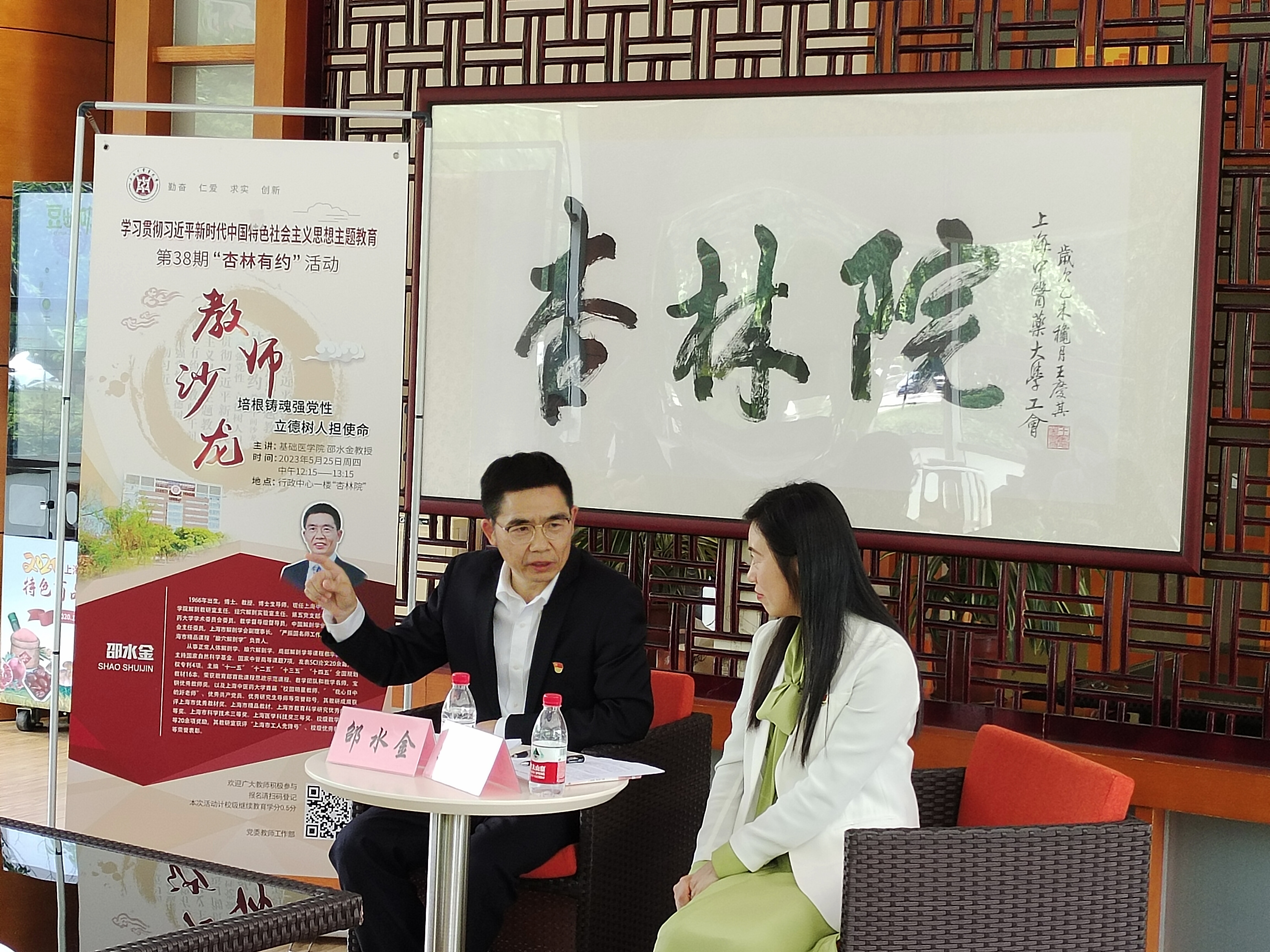 为深入开展学习贯彻习近平新时代中国特色社会主义思想主题教育,5月25日中午,第38期“杏林有约”教师午间沙龙在行政中心一楼杏林院举办。我校基础医学院解剖学教研室主任、第五党支部书记邵水金教授以“培根铸魂强党性,立德树人担使命”为主题受邀作交流分享。宣传部(党委教师工作部)副部长刘虹主持会议,并向邵水金颁发“阳光导师”荣誉证书。