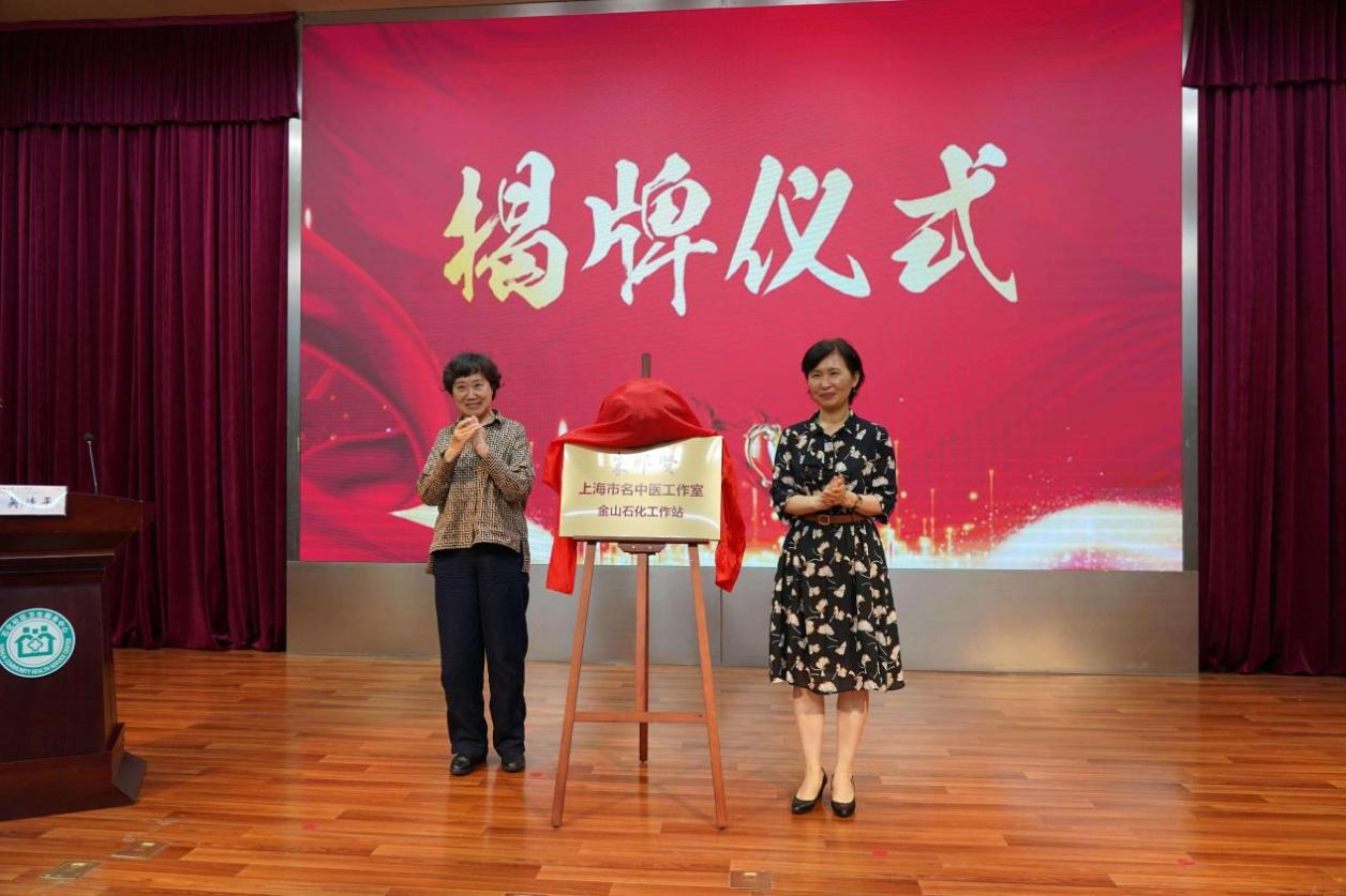赵英与曹婕为“朱邦贤上海市名中医工作室金山石化工作站”揭牌。