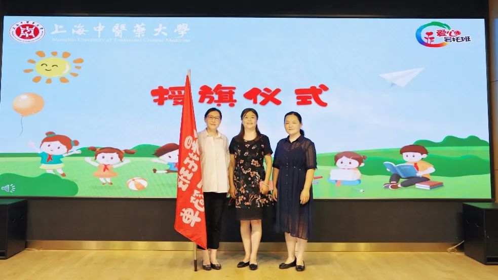 朱惠蓉向中医学院与护理学院这两家承办单位授予爱心暑托班旗帜。