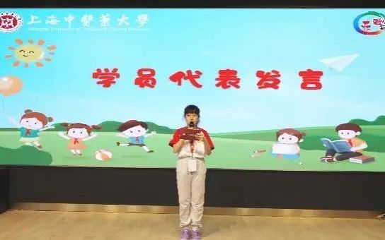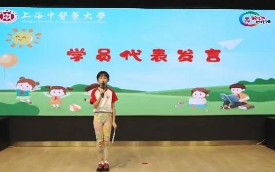 爱心暑托班学员王紫彤、刘允乔代表全体学员上台发言,她们对两周的暑托班充满期待与向往,也对本次参与暑托班组织工作的老师和志愿者们表达了真挚的感谢,并表示将和同学们一起学习新知识、了解中医药、传承中医药。