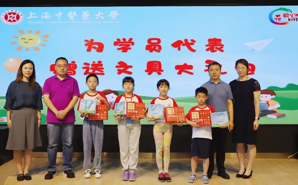 与会领导为爱心暑托班学员代表赠送精心准备的“前程似锦”文具大礼包和“绘声绘色”画笔套装,希望同学们能在暑托班中快乐学习,未来成长为中医药传承创新发展的后备军。