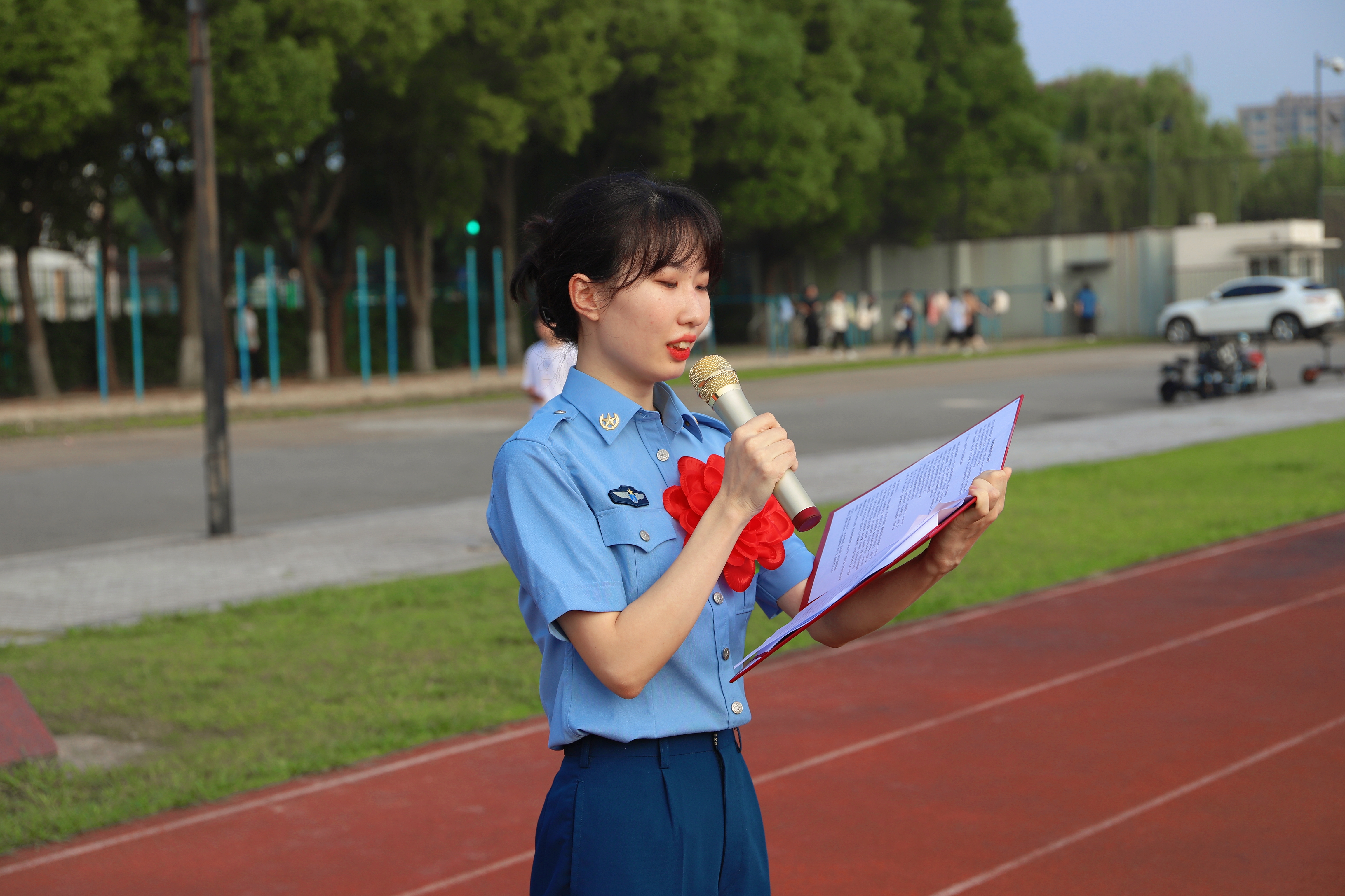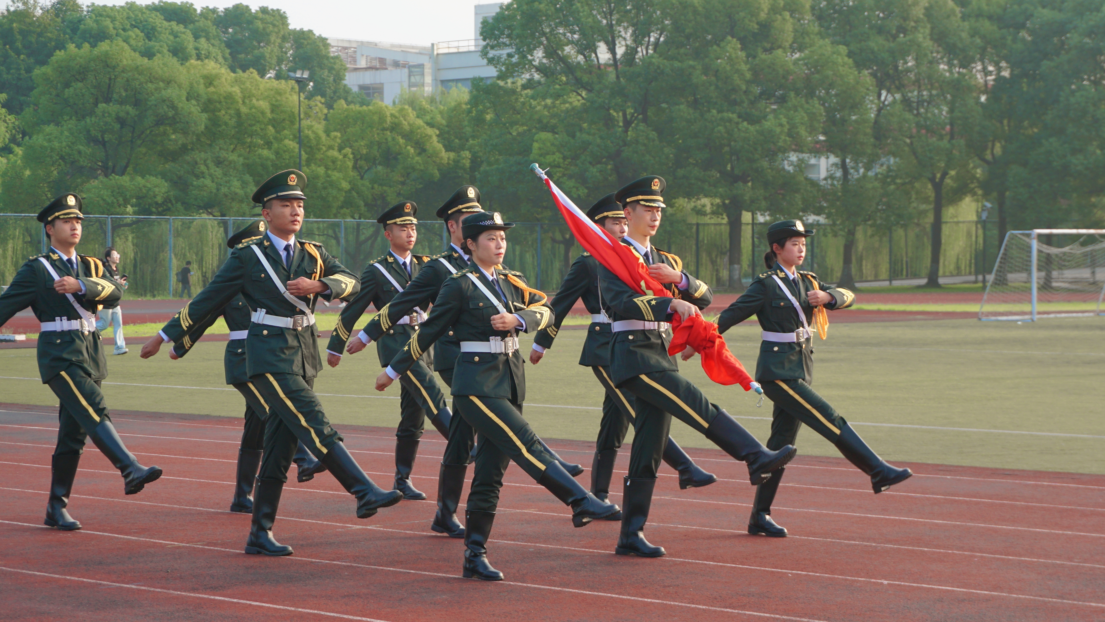 由退役大学生士兵组成的国旗护卫队步履铿锵,护送鲜艳的五星红旗入场。随着五星红旗冉冉升起,全场师生高唱国歌,向国旗行注目礼。