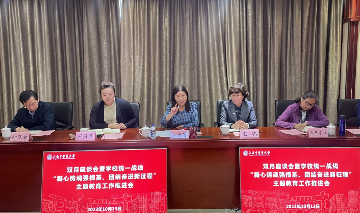 10月13日下午,学校双月座谈会暨“凝心铸魂强根基、团结奋进新征程”主题教育推进会在行政中心428会议室举行。校党委副书记、副校长朱惠蓉出席并讲话,校党委常委、统战部部长王璐,各民主党派、统战团体负责人参加。会议由校统战部副部长严月华主持。