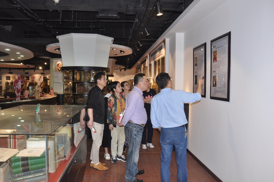 会后,一行人参观我校人体与经穴解剖学陈列馆、遗体捐献文化走廊和人体解剖学实验室等。邵水金介绍镇馆之宝“镜面人”及其捐献者事迹,讲述中医腧穴解剖学发展历程,着重介绍全身腧穴塑化标本这一具有中医特色的珍贵展品。