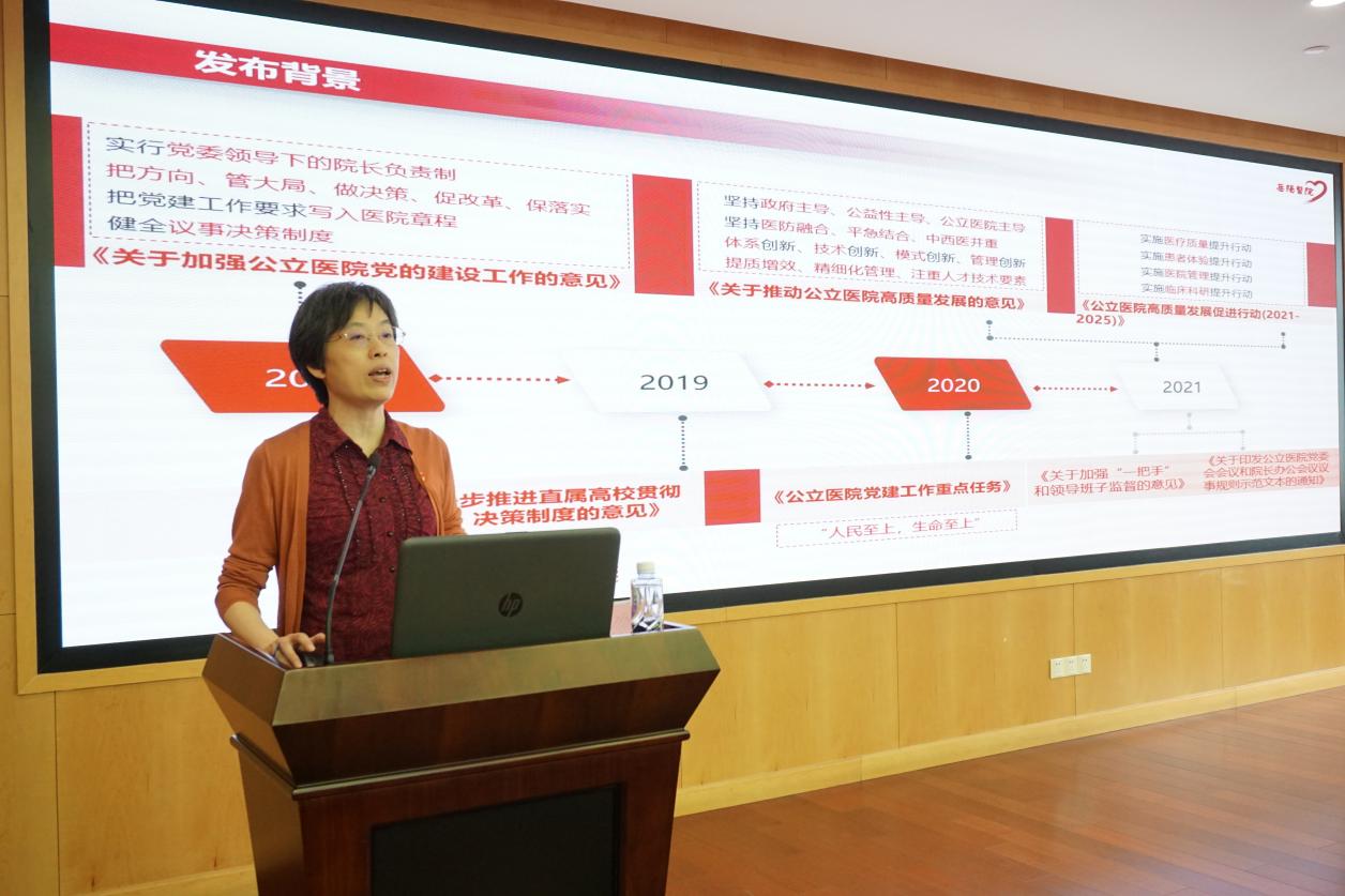 郑莉从“学懂弄通文件精神”“党建贯穿办院治院全过程”“建成基层党组织战斗堡垒”“新起点上党建引领高质量发展”四个方面,通过对公立医院党建工作发展脉络和背景情况的梳理,以及讲述在党建工作中的生动案例,深入浅出地阐释了如何充分发挥公立医院党委的领导作用,切实提升公立医院基层党建工作水平,将党建工作与业务工作深度融合,坚持人民至上,为人民谋健康,把基层党组织建设成为医院新时代中医药事业发展的坚强战斗堡垒。郑莉希望广大党员干部把习近平新时代中国特色社会主义思想转化为坚定理想、锤炼党性和指导实践、推动工作的强大力量,继续扎实推进主题教育,在党建引领、制度建设、平台搭建、人才培养、科技成果转化等方面不断走深走实、见行见效。