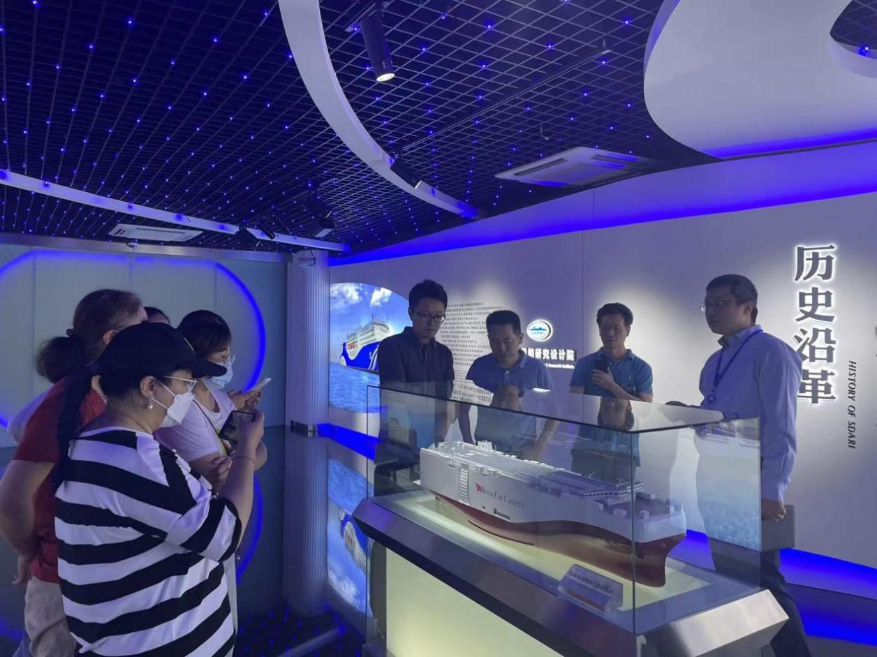 师生们在上海船舶研究设计院黄尊礼的带领下,参观了智能船舶创新实验室、上海船舶研究设计院院史展厅。上海船舶研究设计院是中国船舶集团有限公司旗下具有国际影响力的船舶总体设计单位,服务范围涵盖船舶研发设计、船舶绿色节能、智能产品业务和船舶全生命周期保障业务。在智能船舶创新实验室,通过AI技术,师生们身临其境感受到了现代船舶的航行体验。在院史展厅,师生们了解了上海船舶研究设计院及我国船舶设计建造发展历史。师生们被设计院致力于提升我国智能船舶产业技术核心竞争力,助力船舶工业转型升级及数字化航运的发展所作出的贡献深深感动,也为我国自行设计的大型船舶服务于全球发展而倍感自豪。