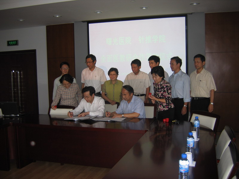 2002年,曙光医院与基础医学院建立了全面合作关系,基础医学院的教师来到临床第一线,到门诊,下病房,直接参与临床医疗工作,此举不仅提高了大学教师的临床水平,使理论与实践结合起来,同时也提高了临床医师的中医理论水平,整体推动了医院的中医学术发展。2004年开始,曙光医院先后承担了基础医学院中医基础理论方向七年制学生、中药学院医药结合方向七年制学生的课堂教学以及临床见实习等教学任务。继与基础医学院、中药学院建立合作关系之后,本次与针推学院的合作,标志着曙光医院与学校本部主要二级学院均开展了不同层次的合作,将充分利用学校基础研究的优势,结合临床诊疗特色,推动医院的学科建设。