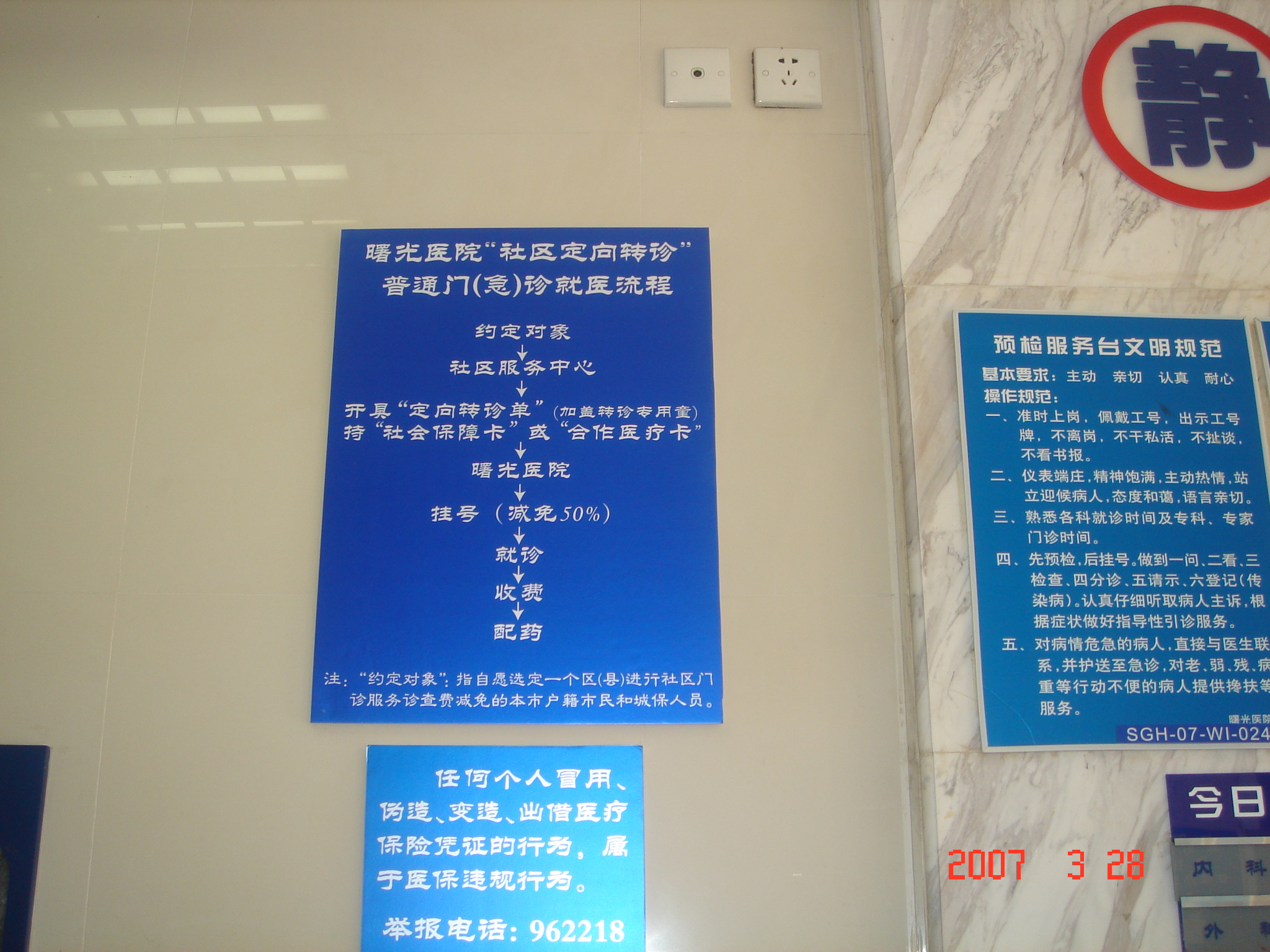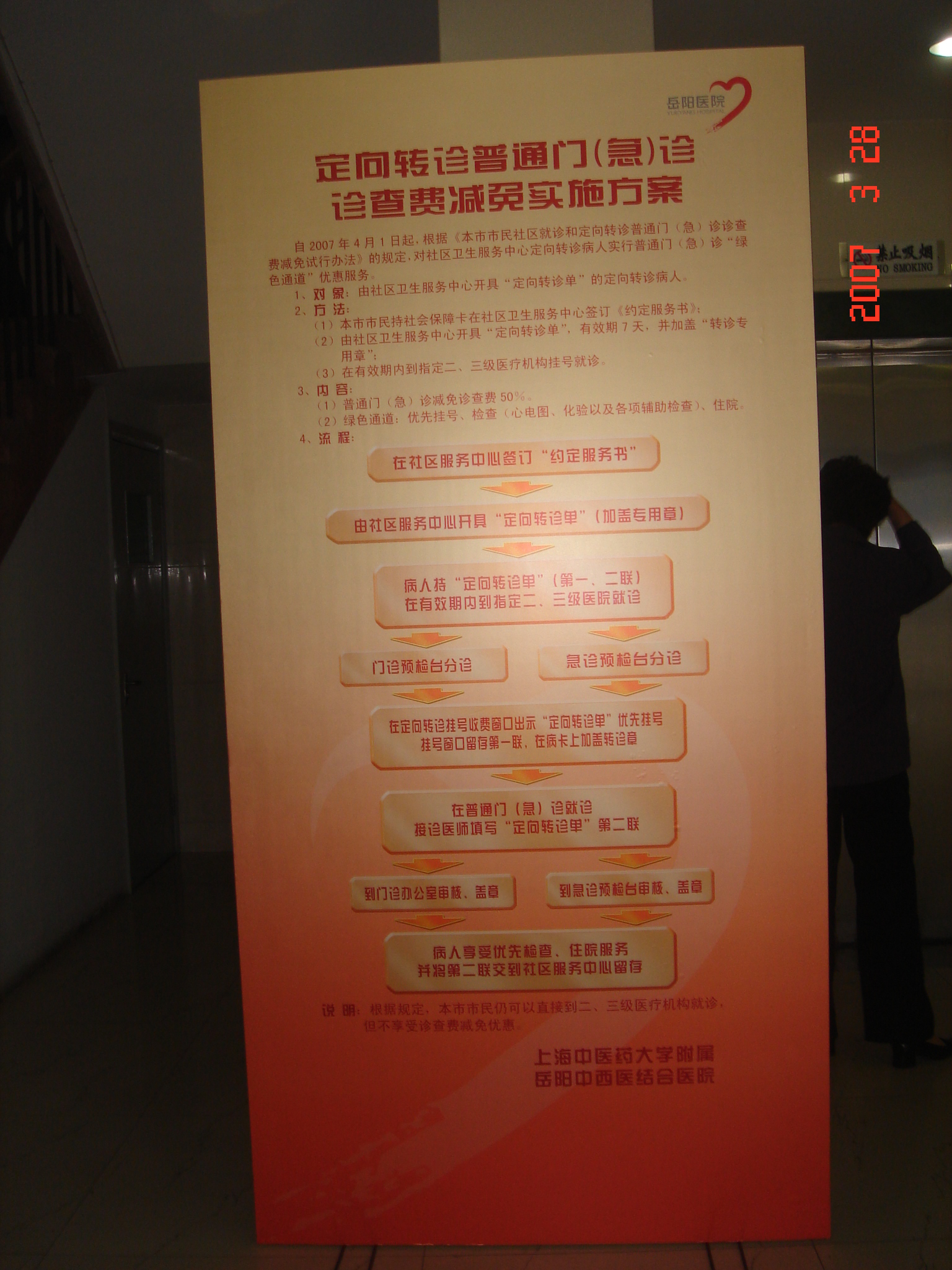 为贯彻落实《本市市民社区就诊和定向转诊普通门(急)诊诊查费减免试行办法》(沪卫基层〔2006〕8号)的有关文件精神,我校各附属医院近期内制定了相关的工作制度和工作流程,在门诊大厅制定了醒目引导标识,开设绿色通道为转诊病人检查、就诊、住院等提供优先服务。医务人员及挂号收费人员接受了相关培训,完成了软件安装调试工作,为4月1日开始社区定向转诊做好了充分的准备工作。
