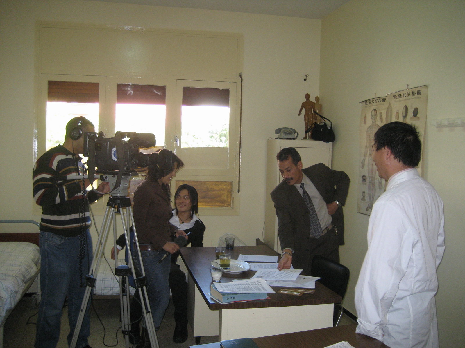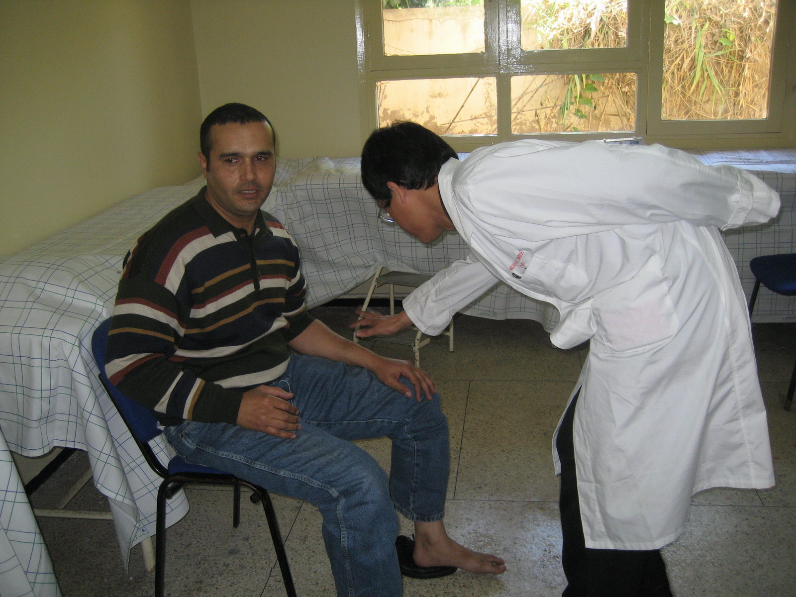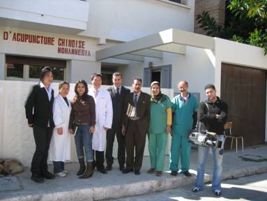 穆罕默地亚卫生厅及省立医院的领导对我们医疗队员所在的中国针灸中心的医疗工作给与大力的支持,于今年2月对针灸中心的诊疗环境修缮如新。对中国针灸医生的细心和蔼的工作态度和精湛的医疗技术赞不绝口。2007年2月26日,摩洛哥电视4台的记者对两位中国针灸医生进行了采访,并于3月2日的新闻报道中播出。主要报道了中国针灸的神奇特色与适应症。为中摩两国政府间的医疗合作及中国传统医学针灸疗法的传播作了有力的宣传。近日来中国针灸中心接受诊治的病人络绎不绝。求诊者除了大量的平民百姓外,还有当地的政府官员及高级人士。如今年3月8日,摩洛哥劳动就业部长夫人因患腰突症2月余,经服药打针均不见效,病情越来越重,以至于腰臀、双下肢疼痛,行走困难。后通过中国驻摩洛哥大使馆而寻求针灸治疗。本队针灸医生孙德利博士接到任务后,初次在金翻译的陪同下出诊拉巴特部长夫人之家。他详细询问病史和检查后予针灸治疗,温针灸L3-5夹脊穴约30分钟,电针秩边-环跳20分钟,然后于腰骶部拔罐20 分钟。并嘱其今后日常生活中保持腰脊正直及适当活动。灸疗完毕部长夫人即感疼痛症状明显减轻。其后孙医生给与隔天出诊治疗一次,共针灸治疗8次而基本痊愈,行走恢复正常,臀腿不痛。仅遗久行时腰酸而已。为此该部长夫人多次给中国大使馆打电话感谢中国针灸医生给他治好了这么严重的疾病。