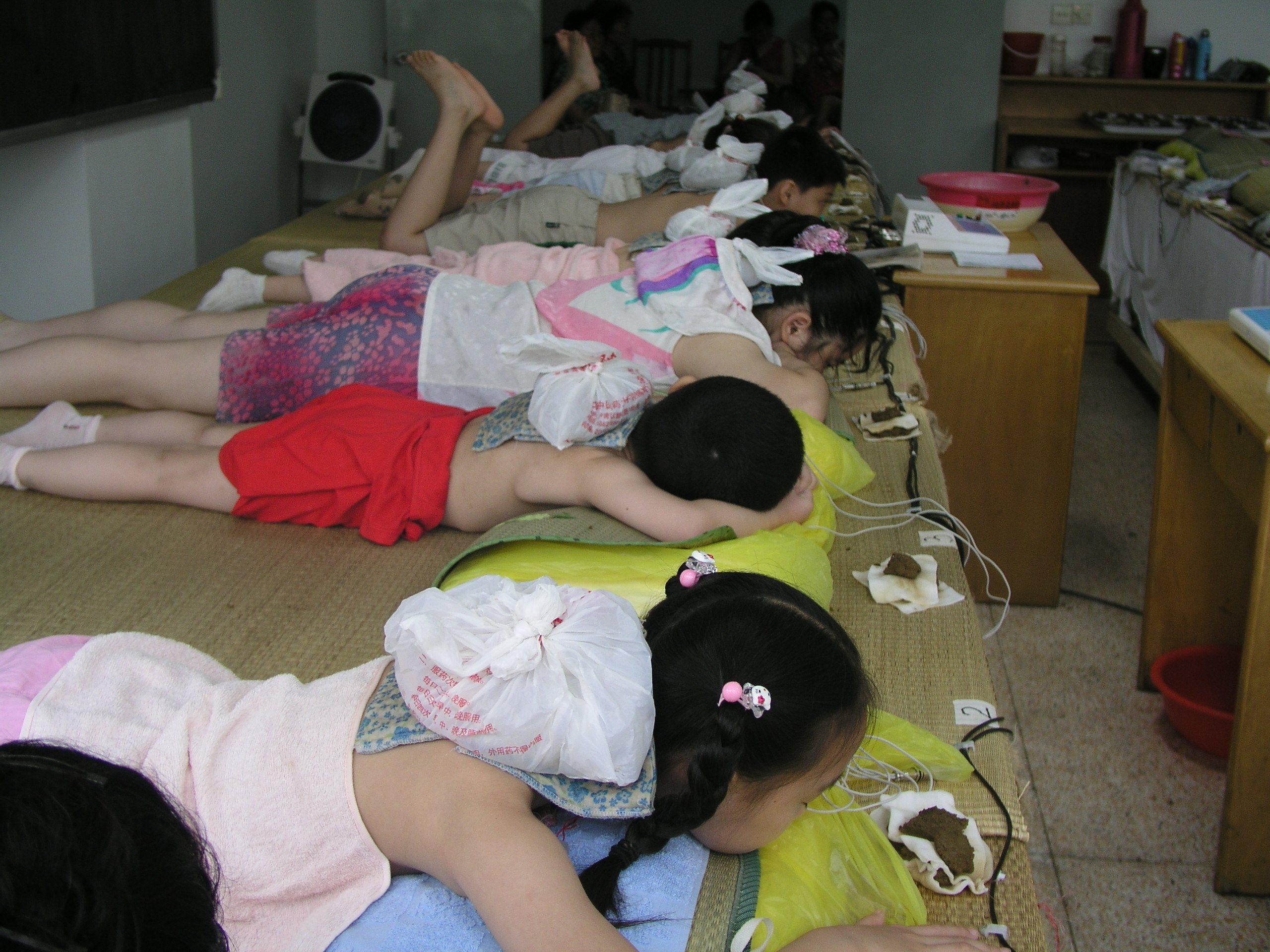 在曙光医院伏天敷贴门诊内,专为敷贴准备的长床上躺着几排小朋友,他们安静地趴卧在床上,背脊上贴着连接电极的中草药膏,悠闲地进行治疗。曙光医院自7月5日开展伏天敷贴以来,一周内治疗人次已达2500余人,其中有半数均为5-10岁的小儿,他们大多数因患有反复性呼吸道感染、过敏性咳嗽、哮喘、过敏性鼻炎等疾病前来就诊,于是医院内热闹敷贴的场景也成了这个暑假里一道特殊的风景线。