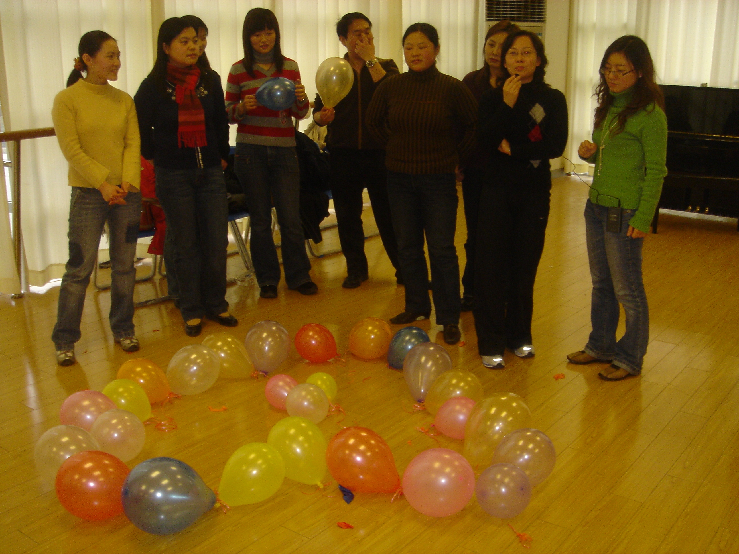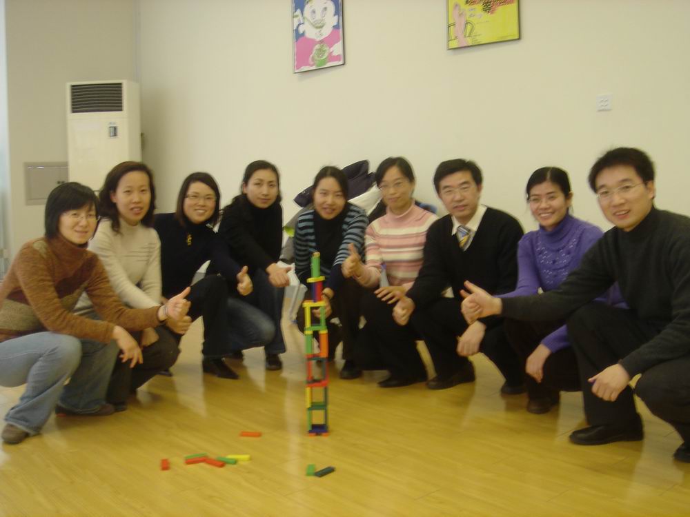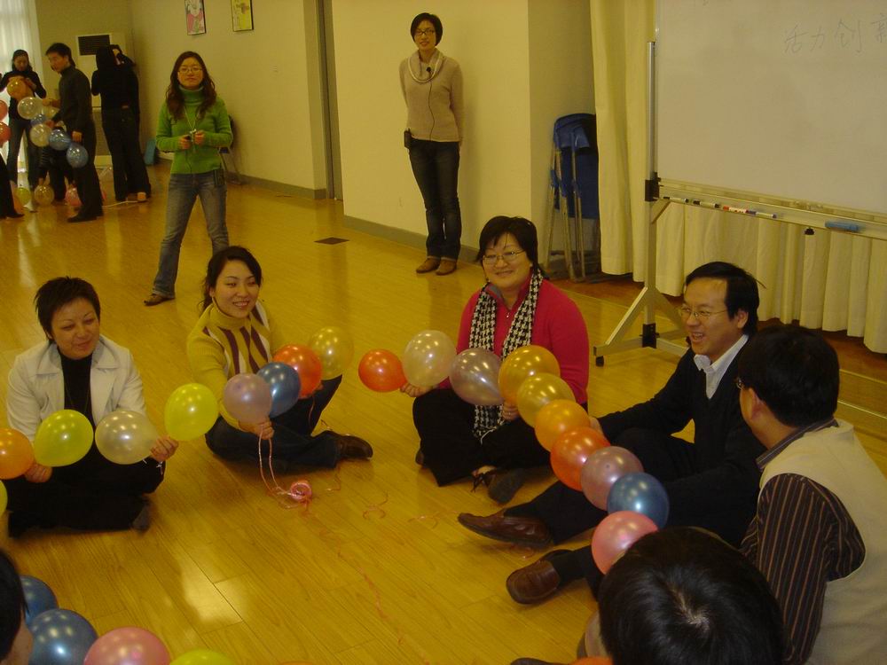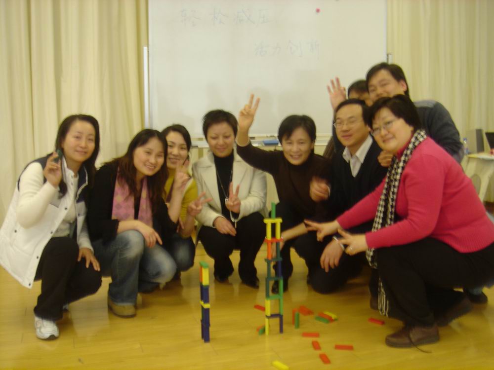整场活动是由丰富多彩,妙趣横生的减压游戏贯穿下来。虽然刚开始后备业务专家和优秀护理人才们表现有些拘谨,但很快便被这些减压游戏吸引并热情投入其中。减压游戏一般都会有明确的指向性和目的性,不同的减压游戏会达到不同的效果。游戏的高潮便是参与者们按生日划分为春、夏、秋、冬四个组,然后以组为单位搭积木(再创高新),吹气球(缤纷人生),挑战烽火线等等。各小组在有限的时间内各显其能,圆满而有创意地完成了任务。这些游戏实际上并不能真正消除压力,而是将压力具体地“梳理”和“描绘”出来,使人们得以正视和面对。由于压力的“无形”常使人感觉无措和疲惫,因此打破这种“无形”,就达到了“减压”的目的。与此同时,减压游戏营造给参与者一个团结协作,发挥创新力的氛围,激发大家遇到困难,知难而上,共同克服。