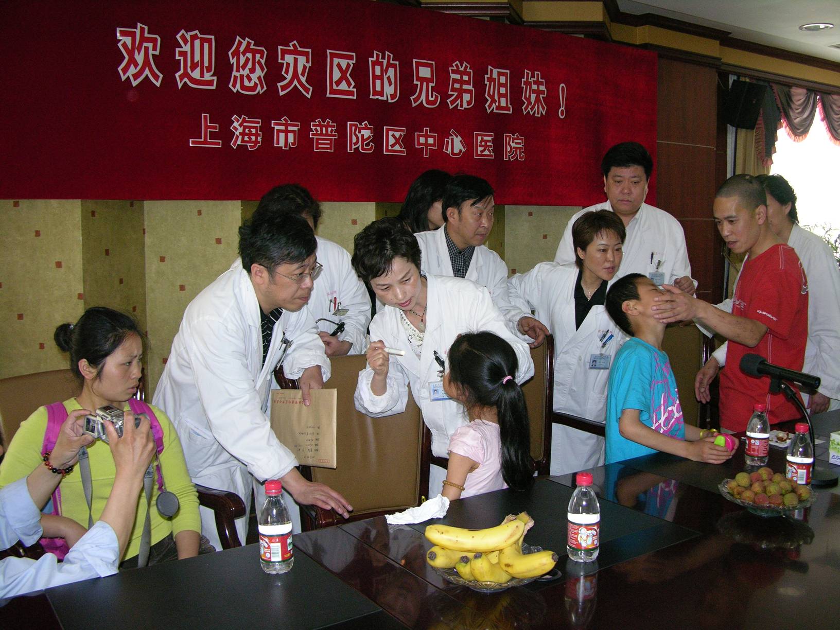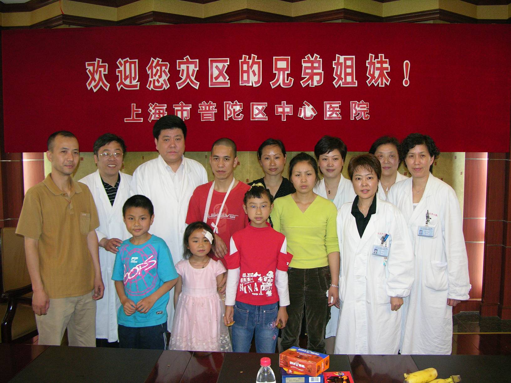 5月20日上午,院党委副书记黄建军、副院长孔令伟、院办主任王金玉、医务科科长叶军等相关科室负责人热情接待了来自我国地震灾区四川省都江堰市聚源中学和新建小学的4名师生及其1名家属,医院挑选眼科、耳科、普外科、伤骨科、放射科资深医师与护理人员为其中的3名伤者提供细致周到的诊治服务,以表达医护人员对灾区师生的一份诚挚关爱。(普陀医院宣传科)