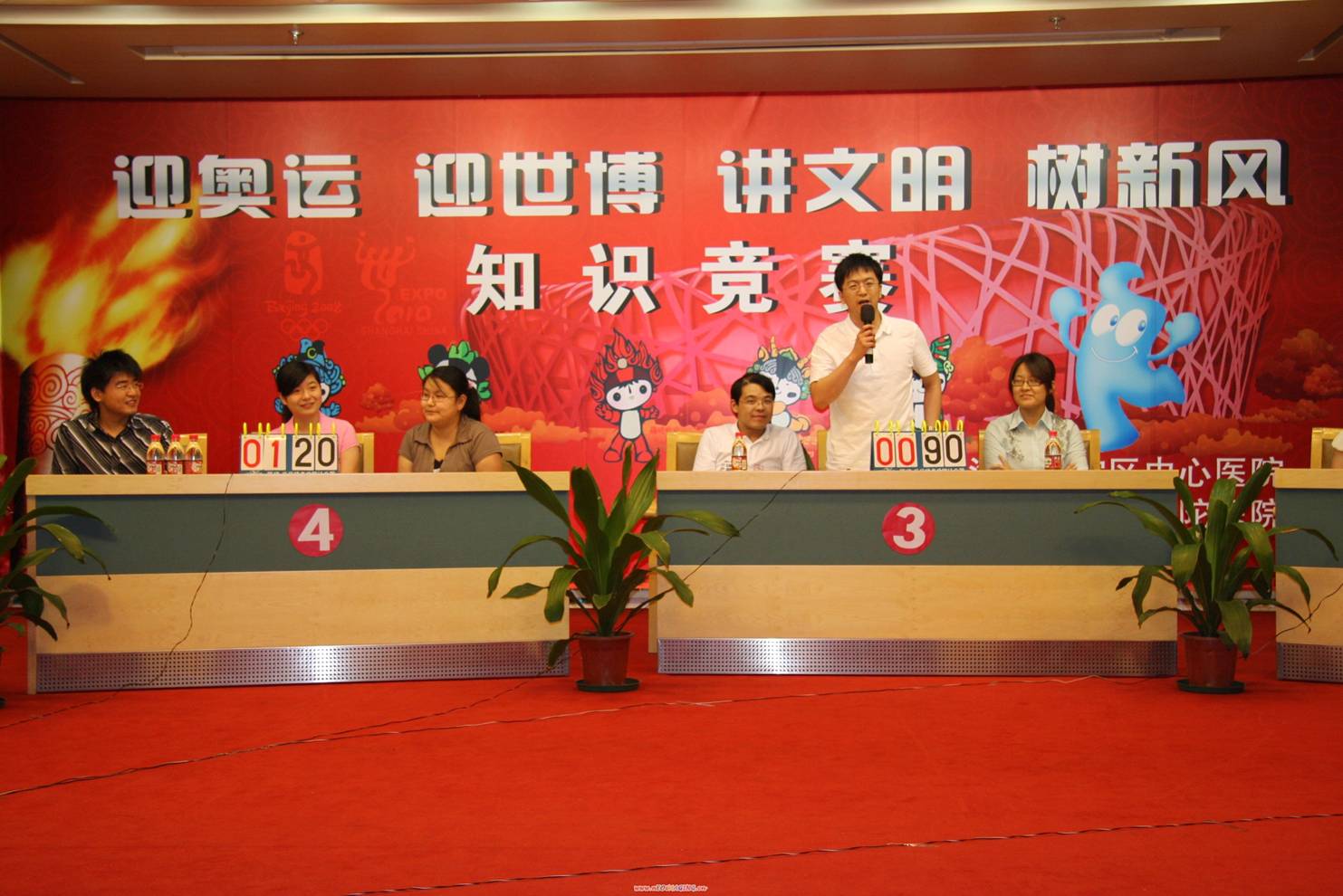 知识竞赛前,医院宣传科精心设计了奥运知识、世博知识、礼仪知识、医院精神、医院文化规范服务知识问卷,并组织全院职工参加了答题活动。全院职工纷纷利用业余时间,认真完成了问卷答题。本次知识竞赛以该问卷为基础,题型分为必答题、抢答题、笔试题三种类型,内容涉及奥运知识、世博知识、礼仪知识、医院精神及医院文化知识、规范服务知识。比赛现场气氛热烈,选手们激情洋溢、信心十足,准确、冷静、机智的回答获得了台下拉拉队和观众们的阵阵掌声。