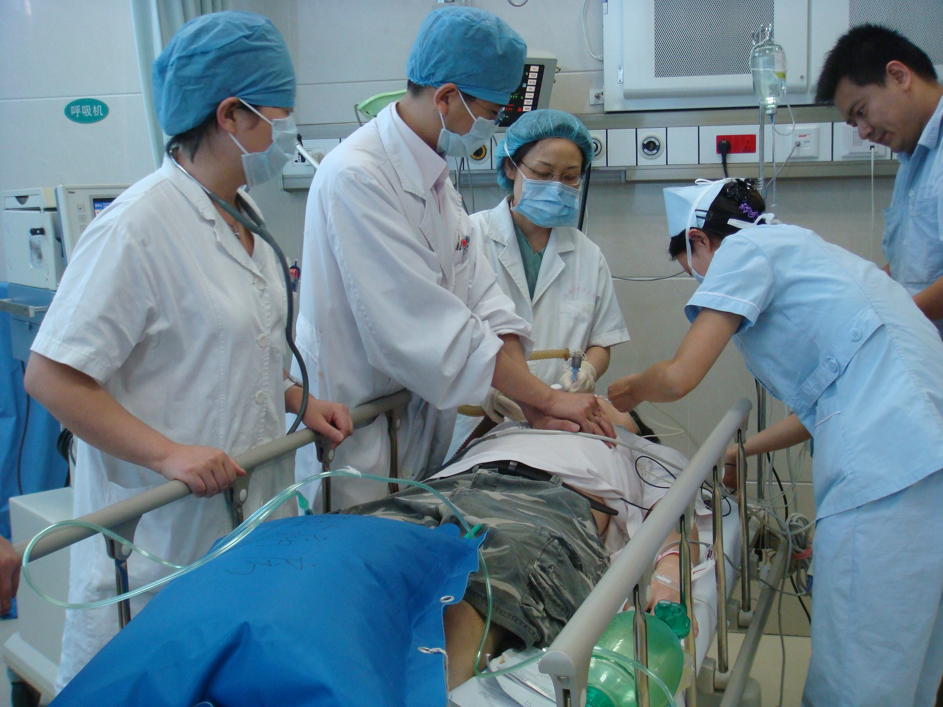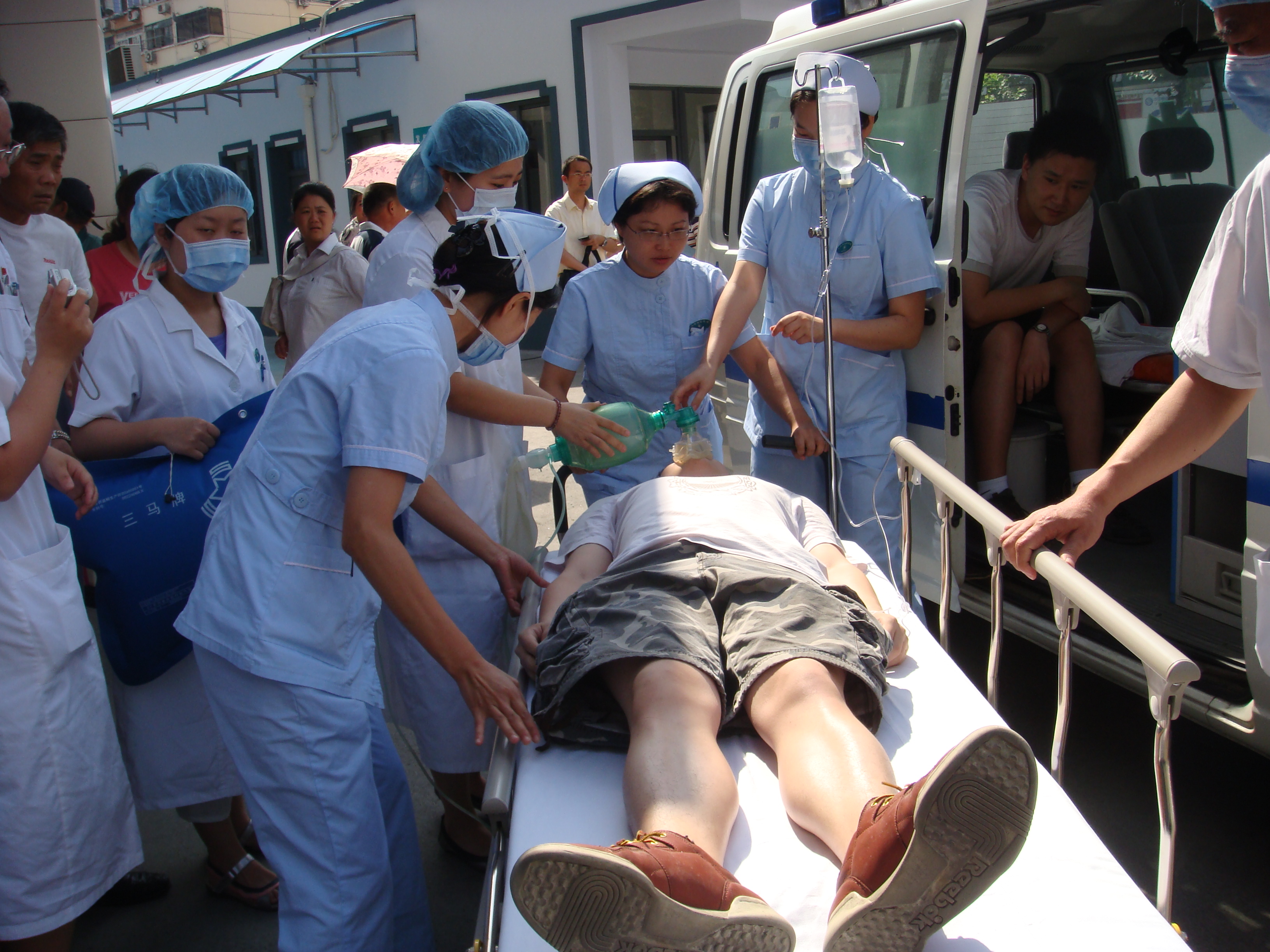 医院急诊科设有“120”专线电话,当“120”现场急救人员在第一时间内通知医院将有10名伤员由”120”送来医院时,医院各临床科室和职能部门立即响应,启动绿色通道,积极应对处置。急诊内科、外科、骨科、抢救室主治医师、急诊二班、住院总、外科二班、骨科二班、内科二班、五官科、眼科、口腔科、心电图室、麻醉科、B超室、放射科、检验科、药剂科、院长办公室、保卫处、总务处、设备处均派出人员参加演练。
