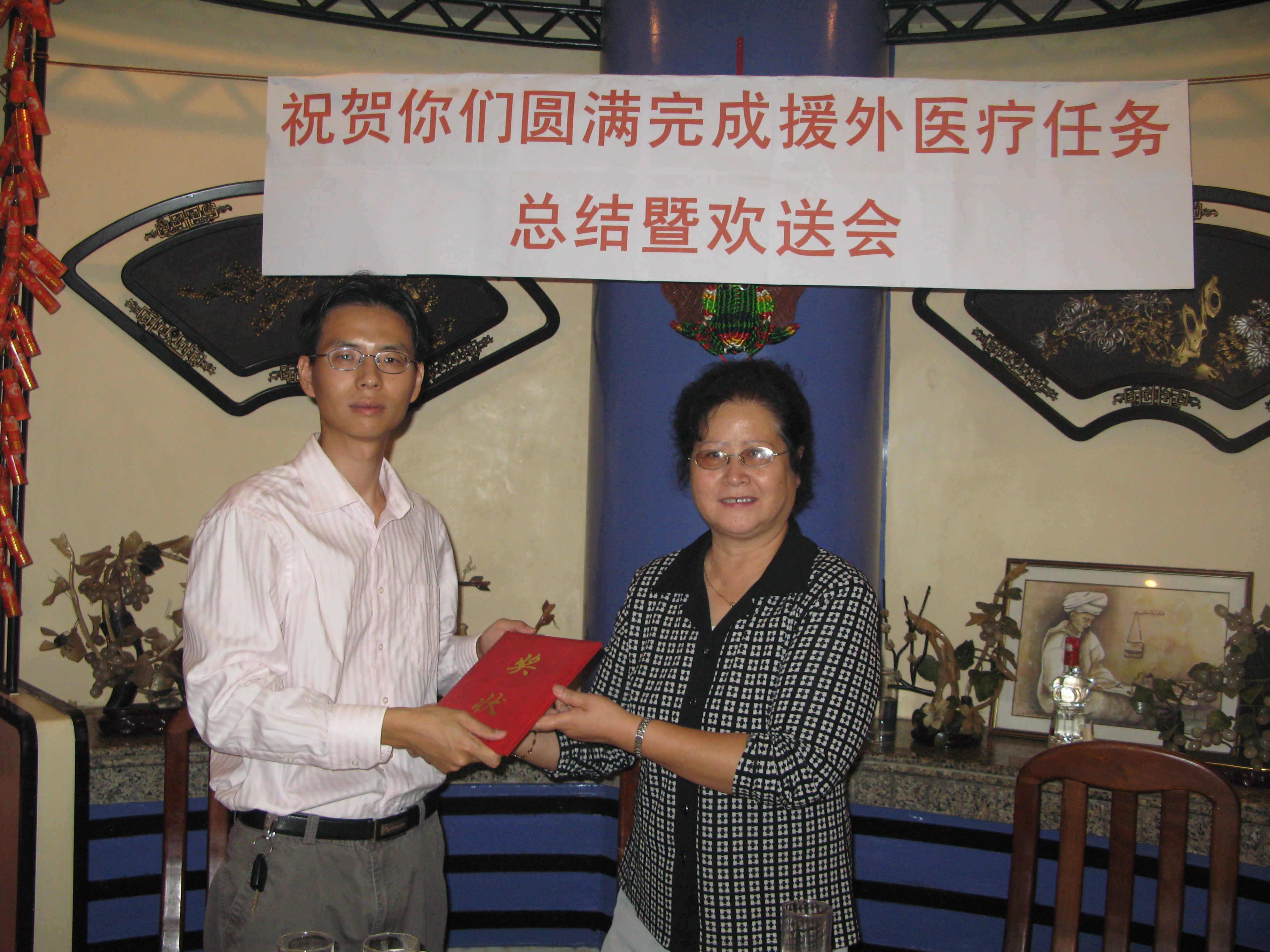 2010年10月13日在摩洛哥首都拉巴特天安门饭店举行了隆重的援摩工作总结暨欢送会。中国驻摩洛哥大使馆经商处王淑敏参赞、援摩总队部全体领导,以及圆满结束二年援摩工作即将归国的穆罕默迪亚、拉西迪亚、荷赛马、塔塔等四个医疗队全体队员40余人参加了会议,援摩医疗队总队部总队长董鸣主持了会议。