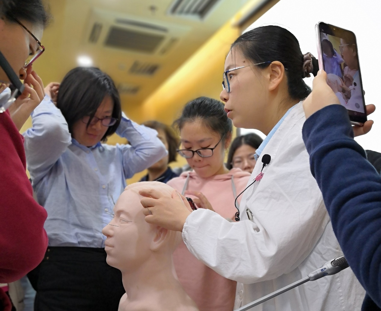 康复医学科主任医师叶秀兰、副主任唐占英医师分别介绍了“整颈三步九法的临床应用”“肩关节病的康复”;针灸科副主任医师戴明、副主任医师孙德利分别介绍了“灸法治疗膝骨关节炎”“针灸结合行为干预治疗颈椎病”;中医传统治疗部主任医师赵海音讲授了“头八针治疗紧张性头痛”;眼科副主任医师朱华英、主治医师王大虎分别介绍了“头针联合眼针治疗视神经萎缩”“睑板腺功能障碍的物理治疗及睑板腺挤压器的应用”;泌尿科副主任医师郁超介绍了“中医传统功法在泌尿系统结石的运用”;中医预防保健科主任医师方泓、副主任医师彭欣分别介绍“COPD肺康复”及“耳穴疗法”。