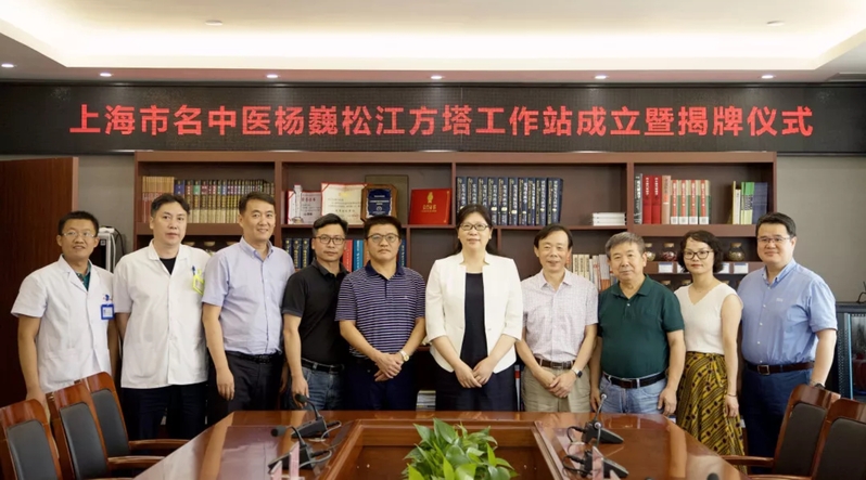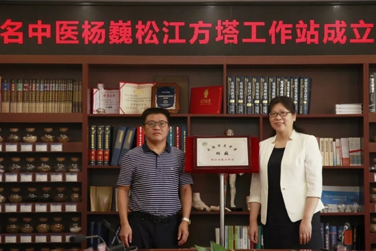 最后,杨巍与方塔中医医院党支部书记顾宜华共同为“上海市名中医杨巍松江区工作站”揭牌并合影留念。(曙光医院)