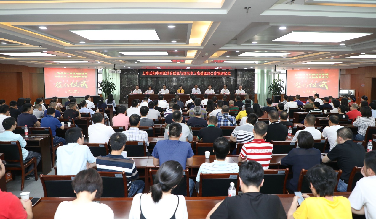 为扎实推进主题教育学深走实,助力长三角医疗一体化发展,9月28日下午,100余名瑞安市中医院的医务员工共同见证了我校附属岳阳中西医结合医院院长周嘉与瑞安市卫健局局长虞峰云签署合作管理瑞安市中医院共建医疗联合体战略合作协议书,瑞安市人民政府副市长张蕙娜等出席签约仪式。仪式由瑞安市人民政府办公室副主任陈玉兴主持。“上海技术、瑞安共享”,这标志着长三角医疗一体化又迈出了新的步伐,让更多长三角居民在家门口就可以享受到上海的优质医疗资源。