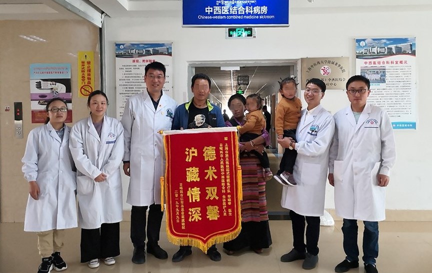 近日,上海市第九批援藏干部、我校附属龙华医院皮肤科副主任、日喀则市人民医院中西医结合科主任李晓睿以及日喀则市人民医院中西医结合科全体医务人员收到了一面写有“沪藏情深,德术双馨”的锦旗。这是年仅4岁的藏族女童在出院时由她父母送来的,向全体医务人员的精心救治表示感谢。