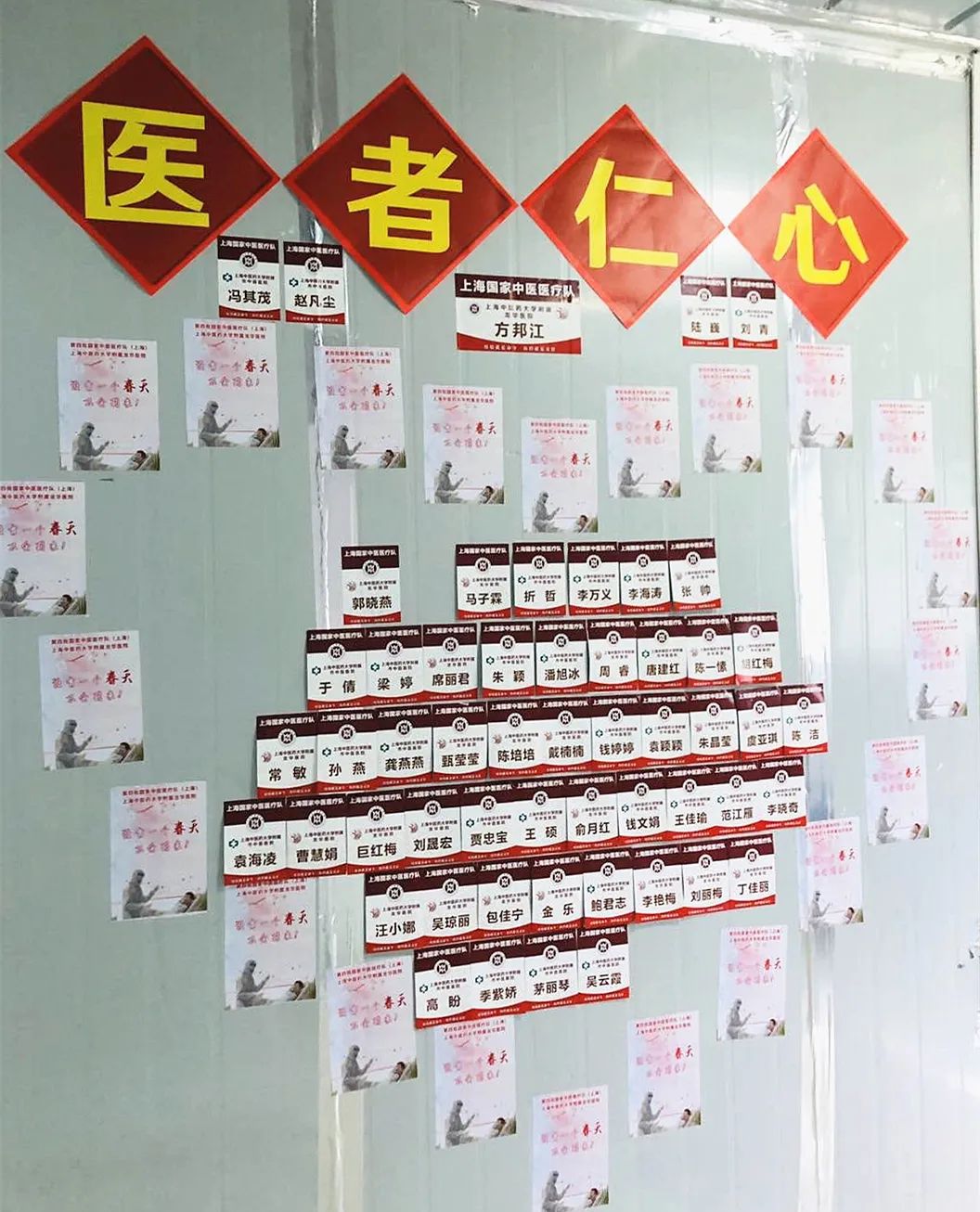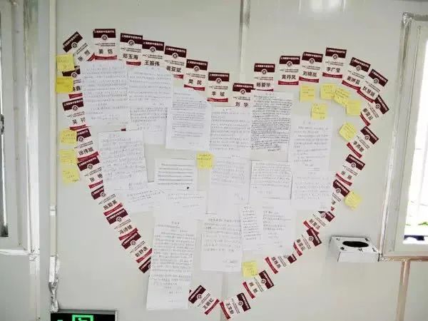 医患共情,无论是在武汉雷神山医院C5病区还是在由附属曙光医院和岳阳中西医结合医院分队接管的C7病区,都有这样一面爱心墙。在病人可以活动的外走廊的墙壁上,全队所有医护人员的姓名贴组成了一个大大的爱心,中间贴着医护人员对病人鼓励的话语和患者们写下的感谢信。