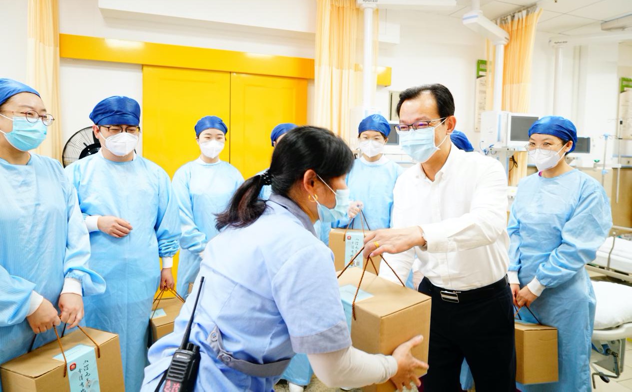 校领导们与各医院党政领导班子先后前往门诊流调处、急诊、儿科及冬病夏治门诊、药房、收费及医技等部门,亲切慰问一线工作人员,代表学校党委感谢医务人员在疫情防控的关键时期,不惧酷暑,坚守岗位,为上海百姓提供高效、优质、温馨的服务,叮嘱他们注意身体,在确保工作任务顺利完成的同时,做好防暑降温工作。同时还送上了防暑降温用品以示感谢和关怀,并强调在疫情期间要把好医院流调关,更要紧绷安全这根弦。