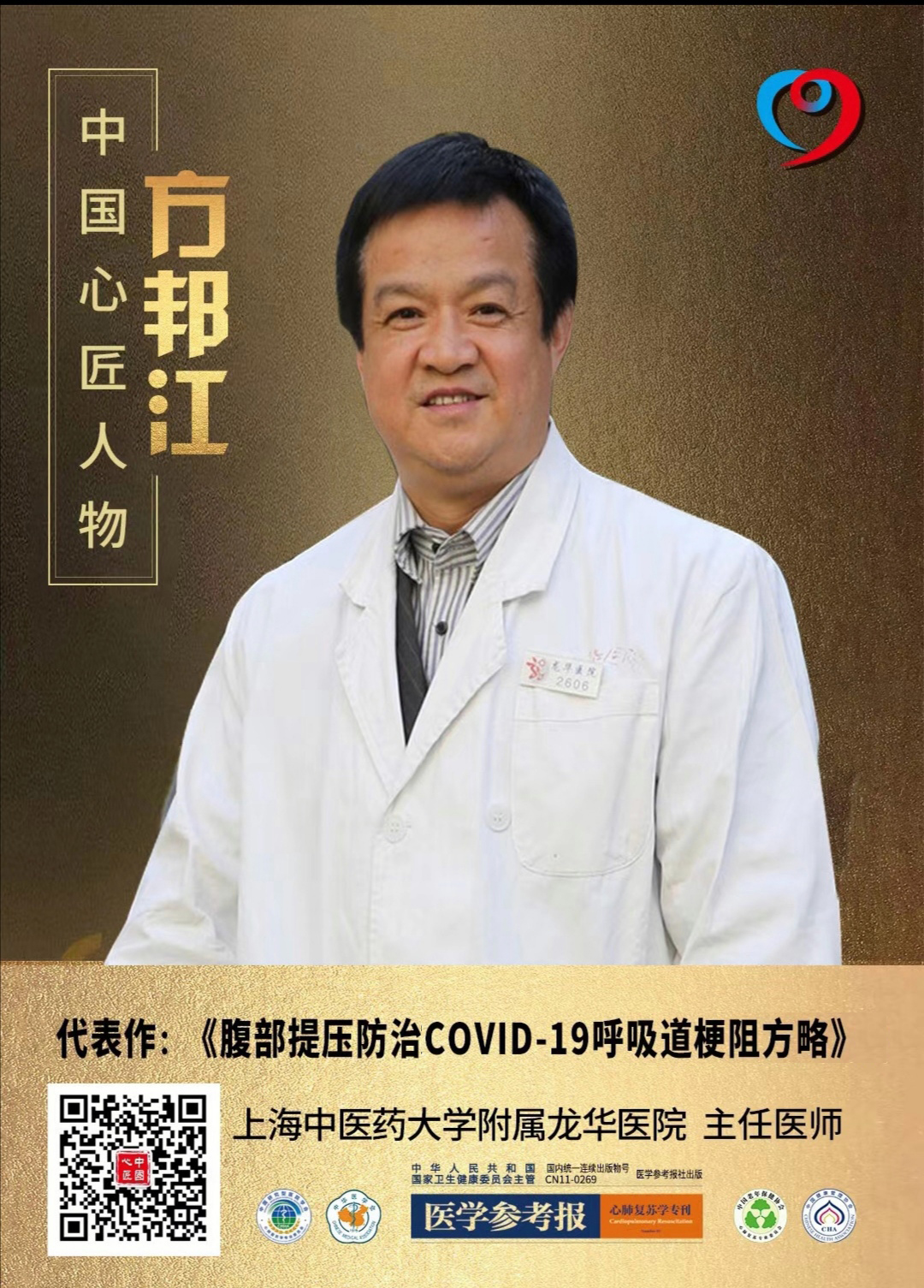 近日,由国家卫健委主管的《医学参考报心肺复苏学专刊》会同中国研究型医院医学会心肺复苏学专业委员会、中华医学会科学普及分会、中国老年保健协会心肺复苏专业委员会、中国健康管理协会健康文化委员会等组织的“中国心匠人物”评审中,龙华医院急诊科主任方邦江教授荣获“中国心匠人物”称号。