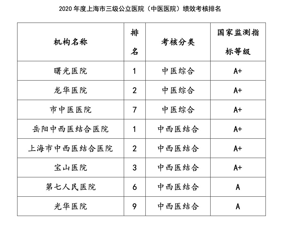 附属曙光医院、龙华医院分列全国三级公立中医医院绩效考核前两名,曙光医院已连续三年获考核第一名;附属岳阳中西医结合医院、上海市中西医结合医院、宝山医院分列全国三级公立中西医结合医院绩效考核前三名,岳阳中西医结合医院也已连续三年获考核第一名;共6家附属医院获A+等级。