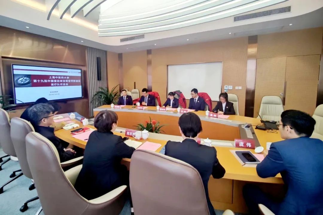 出征仪式上,相关附属医院分管院领导介绍了各自医院派出的队员,本批医疗队队员有曙光医院针灸科副主任医师童秋瑜、推拿科主治医师王炜,附属龙华医院针灸科主治医师沈含冰、厨师张贤国,及上海市医事团体联合管理发展中心派出的翻译黄雅。队长童秋瑜代表医疗队向大学及派出医院汇报了脱产培训情况及医疗队的工作计划等,她表示将带领队员从国家整体利益和外交大局的战略高度,认真工作,圆满完成援外医疗的光荣任务。