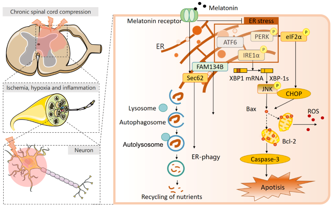 该病由于颈部静态或动态压迫,使脊髓张力和血管供应改变,进而导致缺血、缺氧和血脊髓屏障破坏,最终引起神经元凋亡、脱髓鞘和神经炎症等病理改变,导致脊髓神经功能丧失。内质网应激是内质网稳态的重要组成部分,本项目团队之前的研究中已经在慢性颈髓压迫大鼠模型中观察到,但内质网稳态与CSM的关系尚不清楚。褪黑素是一种公认的抗氧化药物,已被证明对急性脊髓损伤有治疗作用,但其在CSM病理过程中的作用及潜在机制仍不清楚。