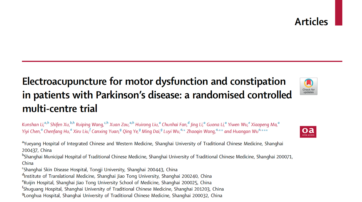 近日,柳叶刀The Lancet杂志子刊eClinicalMedicine以研究长文形式发表了我校附属岳阳中西医结合医院吴焕淦教授团队最新临床研究成果Electroacupuncture for motor dysfunction and constipation in patients with Parkinson’s disease: a randomised controlled multi-centre trial。该项电针治疗帕金森病的多中心临床研究,由岳阳中西医结合医院与市中医医院、龙华医院、曙光医院及上海交通大学转化医学研究院、瑞金医院等多家单位合作完成,证实了帕金森病患者在服用西药基础上加用电针治疗可以延缓运动症状进展、改善便秘等非运动症状,为针药结合治疗帕金森病的临床应用提供了高质量的循证医学证据。