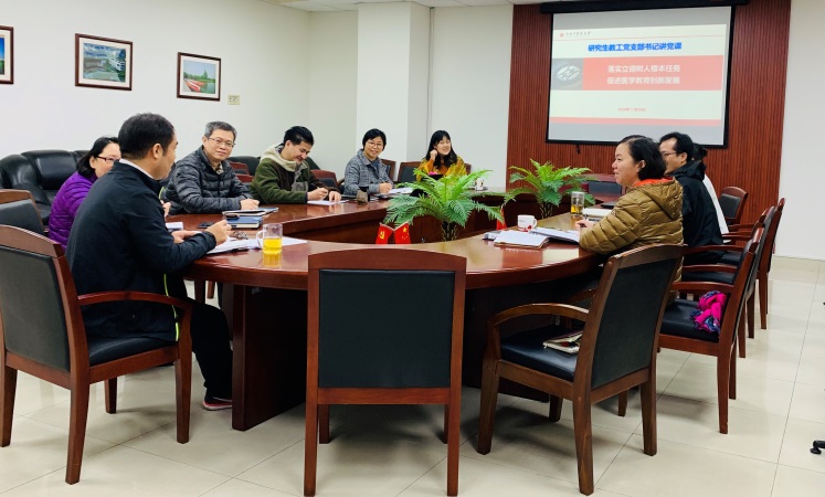 加快医学教育创新发展包含:全面优化医学人才培养结构、全力提升院校医学人才培养质量、深化住院医师培训和继续医学教育改革、完善保障措施。作为中医药院校研究生教育管理部门,在中医药创新能力提升和加强研究生医学教育方面责无旁贷。党课中支部书记重点强调落实立德树人根本任务,要与社会发展相结合,抓好新医科的建设,为国家的发展提供人才保障,全面优化医学教育培养模式。这些都引起在场党员的共鸣。大家纷纷表示要将今天党课学习的内容融会贯通,与本职工作相结合,以新定位推进医学教育发展,服务健康强国、教育强国战略。