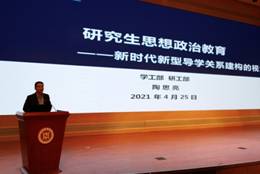 学(研)工部部长陶思亮作“研究生思想政治教育——新时代新型导学关系建构的视角”主题报告,他介绍了现代思想政治教育的体系,强调教书和育人是导师的两大基本职责,导师肩负着研究生思想政治教育的首要责任,通过详实的数据分析说明思想政治引领对构建和谐导学关系的重要性。