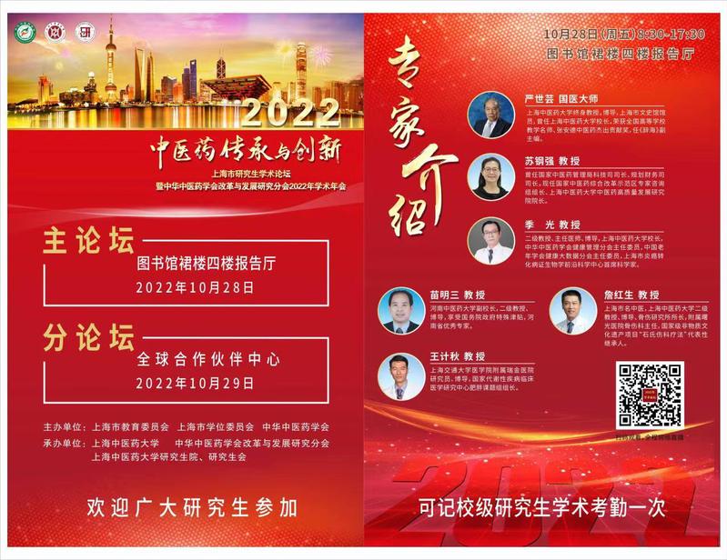 2022中医药传承与创新上海市研究生学术论坛暨中华中医药学会改革与发展研究分会学术年会即将举行,欢迎广大研究生参加!
