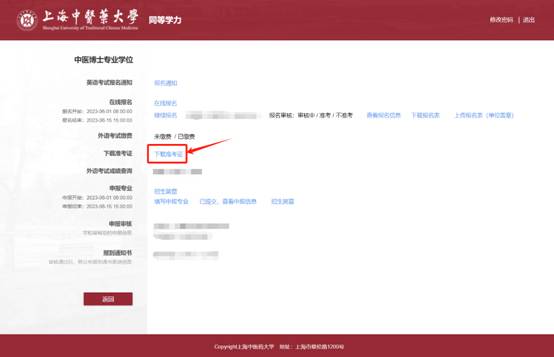 三、准考证:3月4日12:00以后可以登录报名系统自行下载。网址:https://yjsjw.shutcm.edu.cn/gsapp/sys/tdxlxsdappshutcm/login.do,见下图