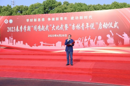 晨起闻鸡鸣,“武”动正青春。4月26日清晨,2023年春季学期“闻鸡起武”大比武暨“杏林青年说”启动仪式在学校体育场举行。学院党委、体育部党支部、党建共建单位的党员代表、学院2022级全体学生等近300名师生参加。活动由2021级中医学(屠呦呦班)常睿发和朱逸菲主持。